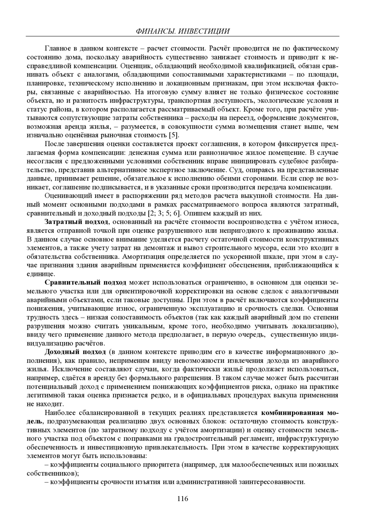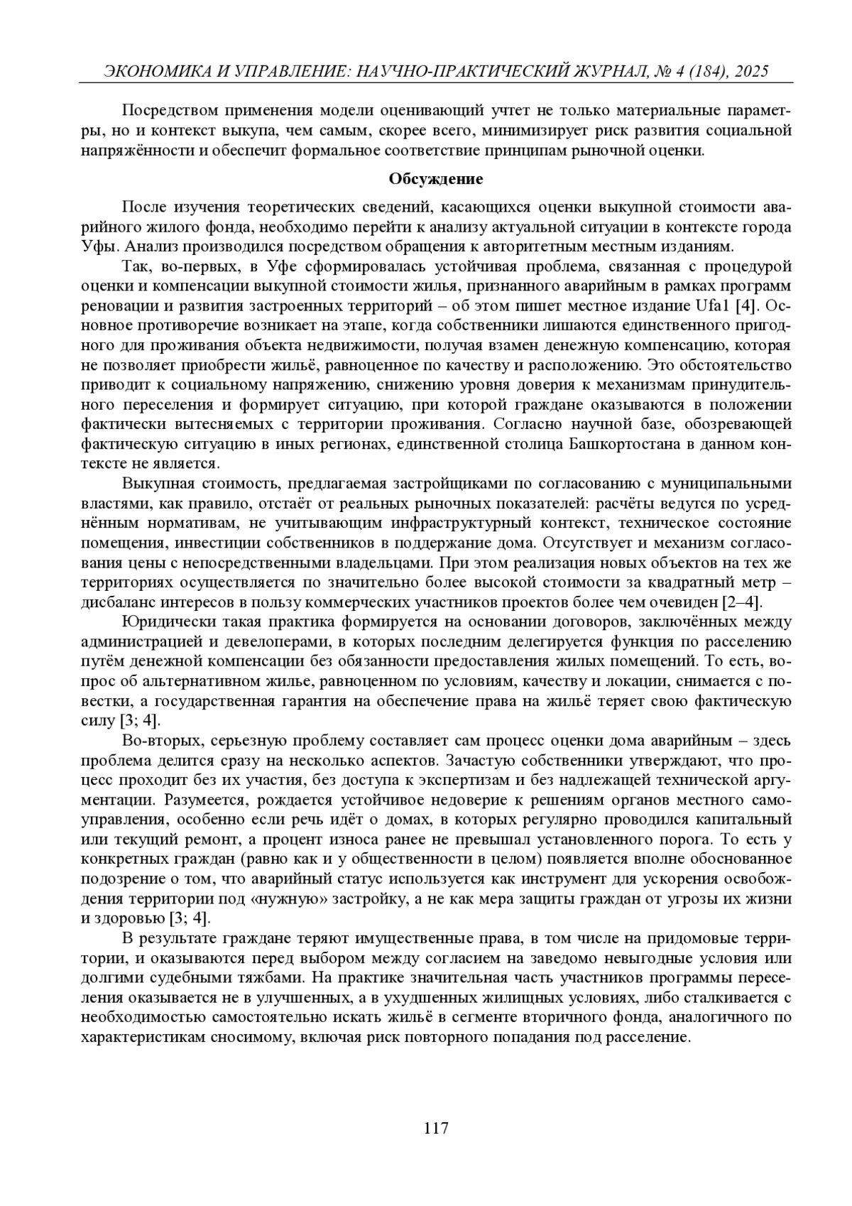 В статье освещаются теоретические основы оценки и выкупа жилых помещений, признанных аварийными, с акцентом на методы расчёта компенсации, правовые процедуры и подходы к формированию стоимости. Представлен обзор действующих моделей оценки с выделением их применимости в условиях изъятия имущества. На основе анализа материалов региональных источников и экспертных комментариев исследуется ситуация в г. Уфе, выявляются противоречия между нормативными положениями и реальной практикой переселения. Отмечается необходимость адаптации механизмов оценки и повышения прозрачности процедур для обеспечения справедливой компенсации собственникам