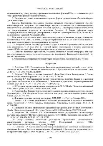 Одним из важнейших институциональных секторов в экономике является сектор домохозяйства. Данный сектор имеет свою специфику формирования ресурсной базы и обладает собственными финансовыми средствами и, являясь одним из субъектов экономической деятельности, формирует спрос на товарном рынке и рынке услуг. В условиях постоянно действующих экономических санкций и ограничений на зарубежные инвестиции возрастает роль частных инвестиций граждан: инвестиции становятся одним из альтернативных источников роста российской экономики. Домохозяйства используют свои ресурсы рационально и сберегают часть доходов, которая в дальнейшем может быть трансформирована в инвестиционный ресурс. Данной теме посвящены следующие работы ученых Института социально-экономических исследований УФИЦ РАН