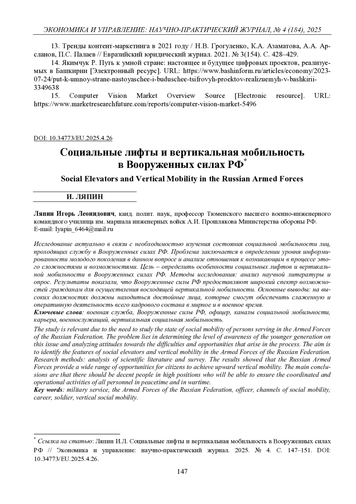 4. Смирнов Н. Н. Карьера офицера как форма социальной мобильности в Вооруженных силах Российской Федерации: социально-исторический аспект // Вестник Майкопского государственного технологического университета. 2022. Т. 14, № 3. С. 144-150. EDN: TIGEXD