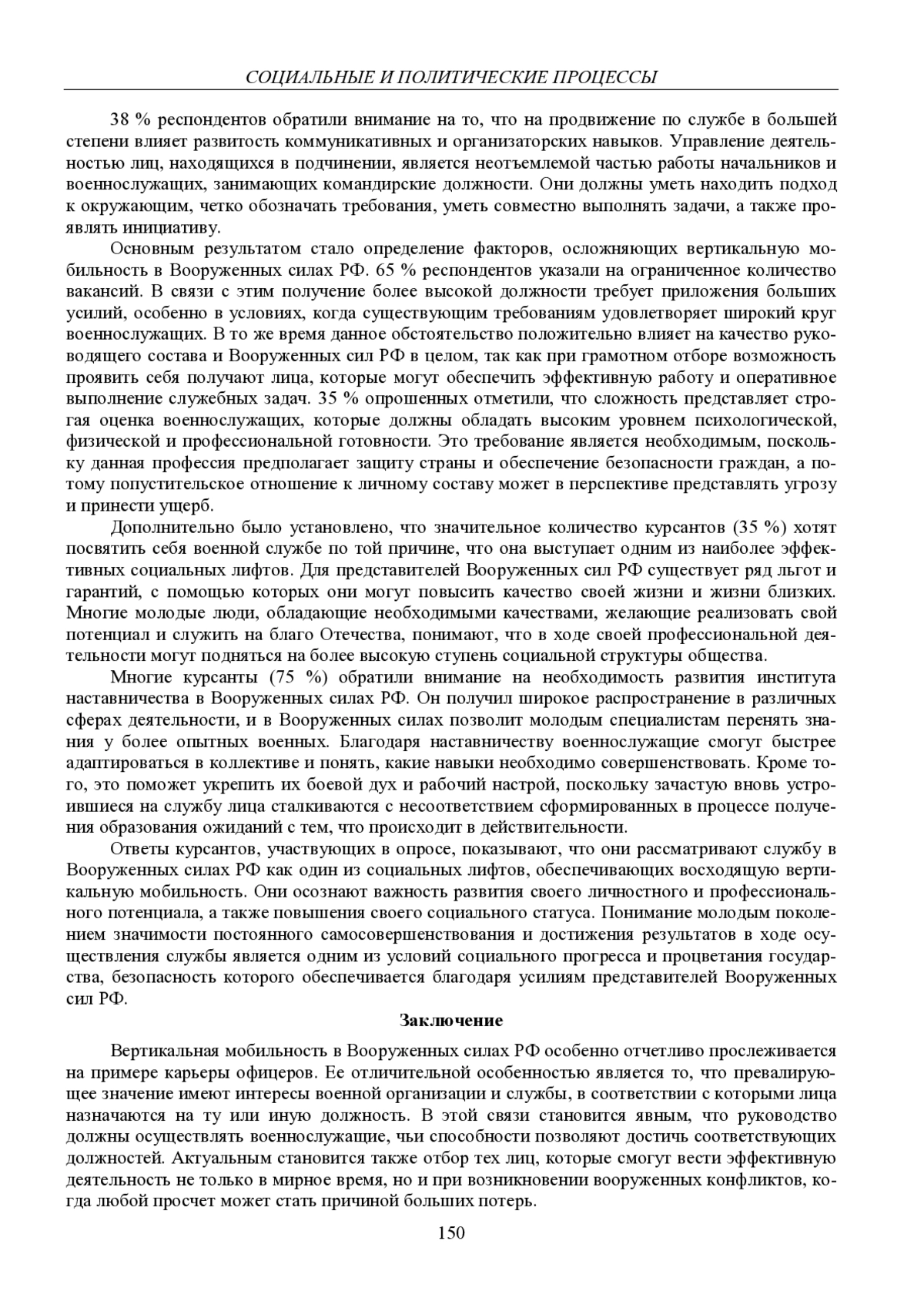 Исследование актуально в связи с необходимостью изучения состояния социальной мобильности лиц, проходящих службу в Вооруженных силах РФ. Проблема заключается в определении уровня информированности молодого поколения в данном вопросе и анализе отношения к возникающим в процессе этого сложностями и возможностями. Цель – определить особенности социальных лифтов и вертикальной мобильности в Вооруженных силах РФ. Методы исследования: анализ научной литературы и опрос. Результаты показали, что Вооруженные силы РФ предоставляют широкий спектр возможностей гражданам для осуществления восходящей вертикальной мобильности. Основные выводы: на высоких должностях должны находиться достойные лица, которые смогут обеспечить слаженную и оперативную деятельность всего кадрового состава в мирное и в военное время