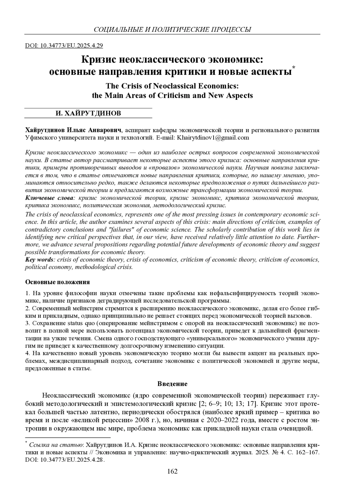 Кризис неоклассического экономикс — один из наиболее острых вопросов современной экономической науки. В статье автор рассматривает некоторые аспекты этого кризиса: основные направления критики, примеры противоречивых выводов и «провалов» экономической науки. Научная новизна заключается в том, что в статье отмечаются новые направления критики, которые, по нашему мнению, упоминаются относительно редко, также делаются некоторые предположения о путях дальнейшего развития экономической теории и предлагаются возможные трансформации экономической теории