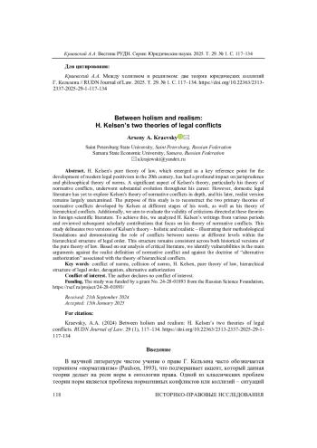 Чистое учение о праве Г. Кельзена, ставшее в XX в. точкой отсчета для развития современного юридического позитивизма, оказало большое влияние на юриспруденцию и философскую теорию норм. Важной частью кельзеновской теории норм, причем частью радикально менявшейся в течение жизни правоведа, стала его теория нормативных коллизий. Вместе с тем в отечественной юридической литературе до настоящего времени не представлены исследования кельзеновской теории нормативных конфликтов, а ее поздний, реалистический вариант практически неизвестен. Цель исследования заключается в том, чтобы реконструировать две основные теории нормативных конфликтов, разработанные Кельзеном в разное время, а также его теорию иерархических коллизий и оценить корректность критики данных теорий, представленной в иностранной научной литературе. Проанализированы работы Г. Кельзена, написанные в разное время, а также научные работы последующих авторов, посвященные его теории нормативных коллизий. В результате реконструированы два варианта кельзеновской теории нормативных коллизий - холистический и реалистический, показаны их методологические основания, а также показана роль коллизий норм разного уровня в теории ступенчатой структуры правопорядка, одинаковая для обеих исторических версий чистого учения о праве. Показана уязвимость основных критических аргументов против реалистического определения нормативного конфликта и против доктрины «альтернативного уполномочивания», связанной с теорией иерархических коллизий.