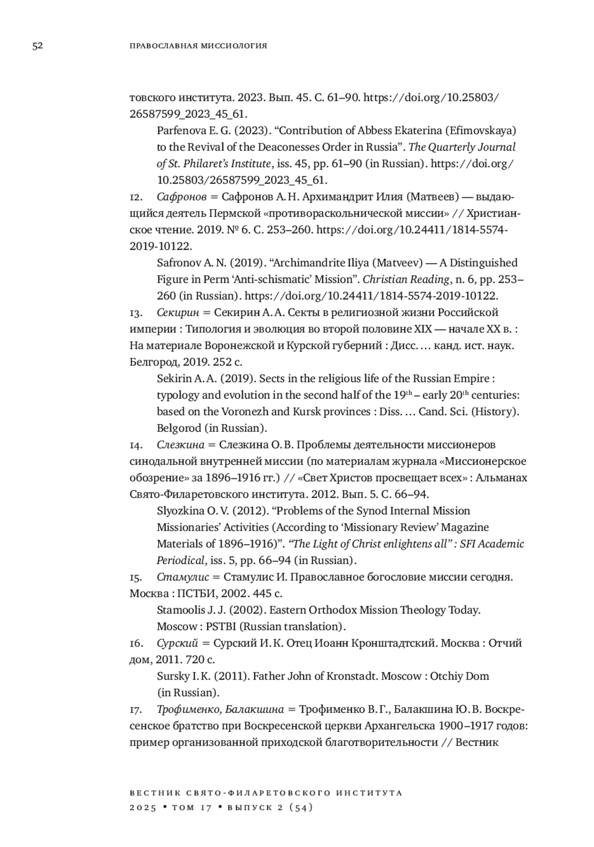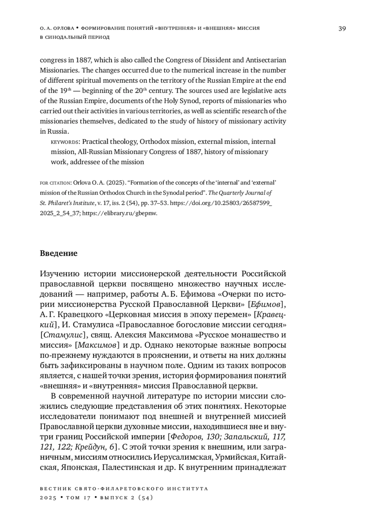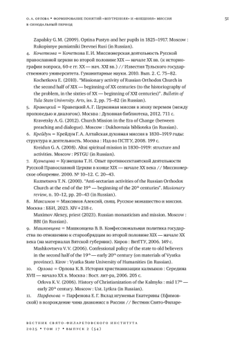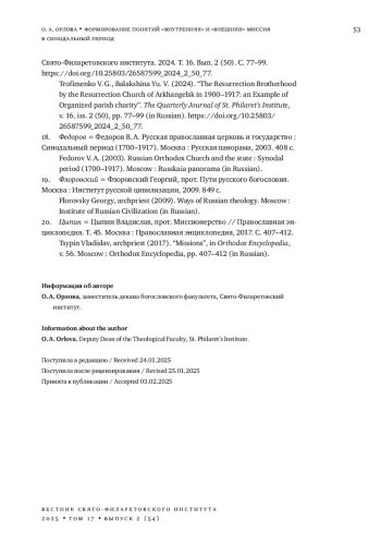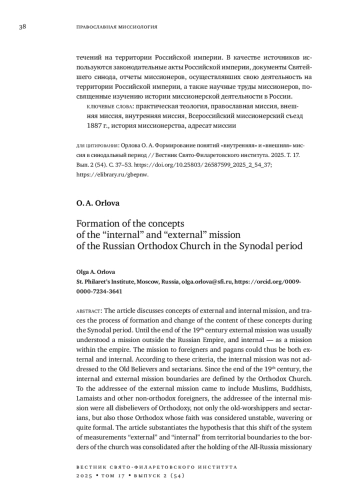 ОРЛОВА О. А. ФОРМИРОВАНИЕ ПОНЯТИЙ «ВНУТРЕННЯЯ» И «ВНЕШНЯЯ» МИССИЯ В СИНОДАЛЬНЫЙ ПЕРИОД // ВЕСТНИК СВЯТО-ФИЛАРЕТОВСКОГО ИНСТИТУТА. 2025. № 2 (54), ТОМ 17