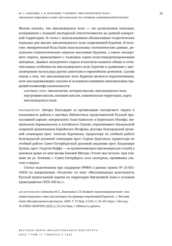 В статье представлены результаты междисциплинарного анализа концепта «миссионерское поле» с использованием богословского, исторического и социологического подходов. Показано постепенное развитие понятия от его натуралистического образа к трактовке поля как пространства осуществления духовных процессов. Со второй половины XIX в. в литературе, посвященной опыту миссионерского служения в различных регионах, в том числе в Забайкалье, все чаще употреблялось выражение «поле миссионерской деятельности», а проводимый в то время анализ миссии предвосхитил современные подходы к составлению карт миссионерского поля регионов. В отчетах дореволюционных миссионеров содержатся описание географии местности, этнографические данные, история религиозных институций, обозначены проблемы православной миссии в контексте специфики региона. В настоящее время историко-культурные и социологические аспекты исследования регионов - та пограничная область, где сходятся интересы светской науки и миссиологии. Концепт «миссионерское поле» пересекается с понятием «религиозная ситуация», которое является одним из центральных в современном религиоведении. Можно сказать, что миссионерское поле - это религиозная ситуация, воспринятая с позиций пастырской ответственности на данной конкретной территории. В статье с использованием обозначенных теоретических подходов дан анализ миссионерского поля современной Бурятии. В качестве эмпирической базы были использованы статистические данные, результаты социологических опросов населения Бурятии, а также экспертного опроса, проведенного с помощью серии полустандартизированных интервью. Данные экспертного опроса позволили выявить общие и отличительные особенности миссионерского поля Бурятии в сравнении с миссионерским полем ряда других азиатских и европейских регионов. Сделан вывод о том, что миссионерское поле Бурятии является перспективным, хотя оно неравномерно освоено и осложнено влиянием многовековых традиций поликонфессиональности.