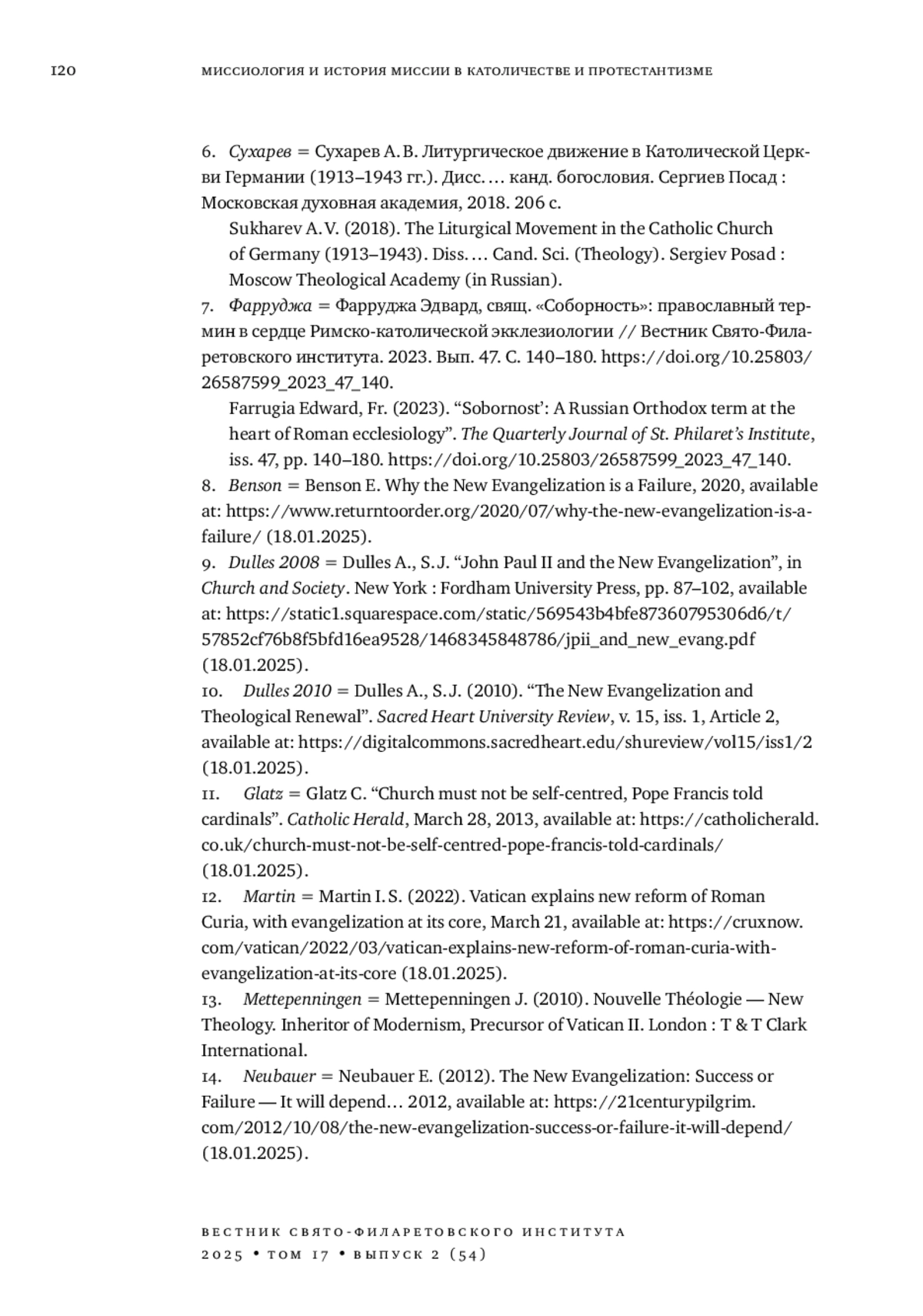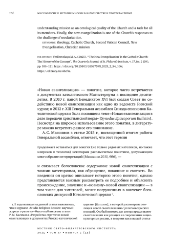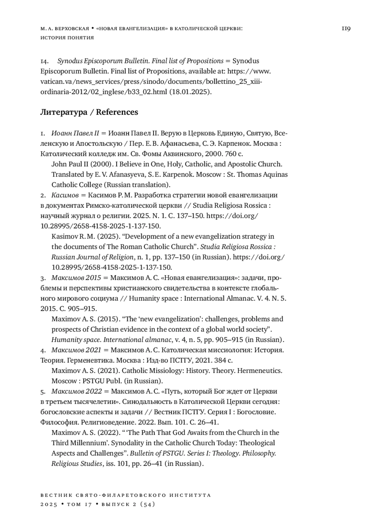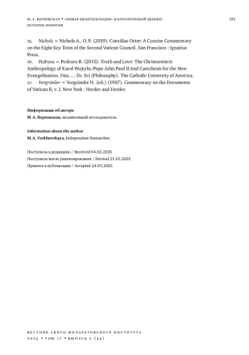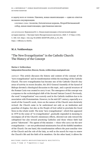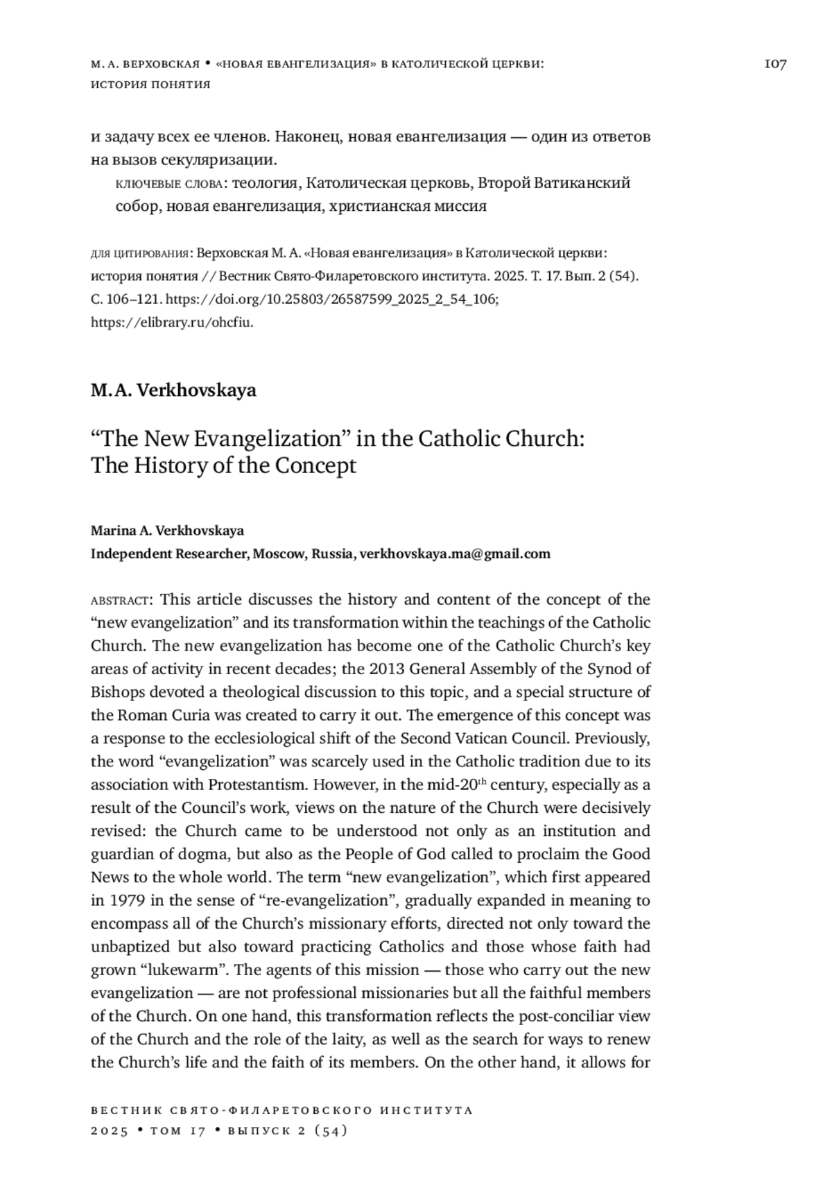 ВЕРХОВСКАЯ М. А. «НОВАЯ ЕВАНГЕЛИЗАЦИЯ» В КАТОЛИЧЕСКОЙ ЦЕРКВИ: ИСТОРИЯ ПОНЯТИЯ // ВЕСТНИК СВЯТО-ФИЛАРЕТОВСКОГО ИНСТИТУТА. 2025. № 2 (54), ТОМ 17