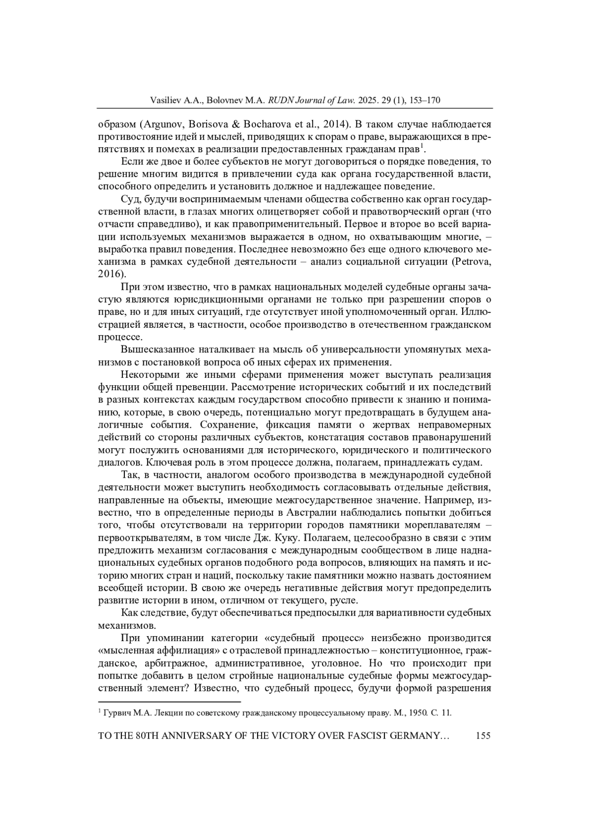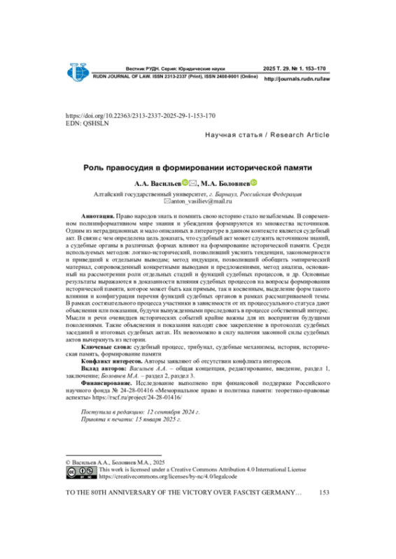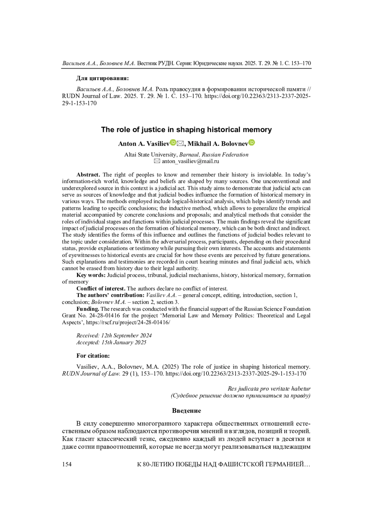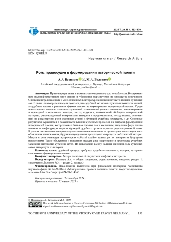 Право народов знать и помнить свою историю стало незыблемым. В современном полиинформативном мире знания и убеждения формируются из множества источников. Одним из нетрадиционных и мало описанных в литературе в данном контексте является судебный акт. В связи с чем определена цель доказать, что судебный акт может служить источником знаний, а судебные органы в различных формах влияют на формирование исторической памяти. Среди используемых методов: логико-исторический, позволивший уяснить тенденции, закономерности и приведший к отдельным выводам; метод индукции, позволивший обобщить эмпирический материал, сопровожденный конкретными выводами и предложениями, метод анализа, основанный на рассмотрении роли отдельных стадий и функций судебных процессов, и др. Основные результаты выражаются в доказанности влияния судебных процессов на вопросы формирования исторической памяти, которое может быть как прямым, так и косвенным, выделение форм такого влияния и конфигурация перечня функций судебных органов в рамках рассматриваемой темы. В рамках состязательного процесса участники в зависимости от их процессуального статуса дают объяснения или показания, будучи вынужденными преследовать в процессе собственный интерес. Мысли и речи очевидцев исторических событий крайне важны для их восприятия будущими поколениями. Такие объяснения и показания находят свое закрепление в протоколах судебных заседаний и итоговых судебных актах. Их невозможно в силу наличия законной силы судебных актов вычеркнуть из истории.