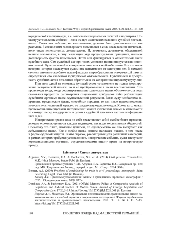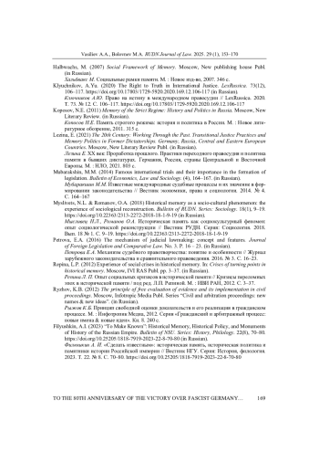 3. 	Дорская А.А., Пашенцев Д.А. Официальная политика памяти: сравнительный анализ законодательства и судебной практики современных государств // Журнал зарубежного законодательства и сравнительного правоведения. 2021. Т. 17. № 6. С. 5-15. DOI: 10.12737/jflcl.2021.061 EDN: GPVVWS
