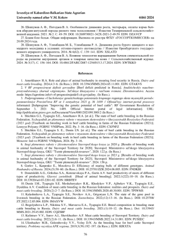 1. Амерханов Х. А. Роль и место животноводства в обеспечении продовольственной безопасности России // Молочное и мясное скотоводство. 2024. № 4. С. 3-6. DOI: 10.33943/MMS.2024.65.11.001 EDN: GTAKVS