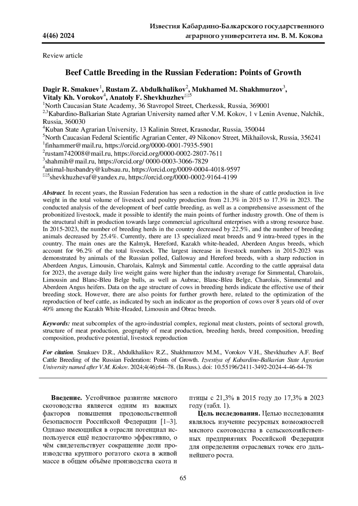 За последние годы в Российской Федерации наблюдается сокращение доли производства крупного рогатого скота в живой массе в общем объѐме производства скота и птицы с 21,3% в 2015 году до 17,3% в 2023 г. Проведѐнный анализ развития мясного скотоводства, а также комплексная оценка пробонитированного поголовья позволили определить основные точки дальнейшего отраслевого роста. Одной из них является структурный сдвиг производства в сторону крупных товарных сельскохозяйственных предприятий, имеющих мощную ресурсную базу. За 2015-2023 гг. количество племенных стад в стране сократилось на 22,5%, а численность племенных животных уменьшилась на 25,4%. В настоящее время в стране насчитывается 13 специализированных мясных пород и 9 внутрипородных типов. Основными из них являются калмыцкая, герефордская, казахская белоголовая, абердин-ангусская породы, на долю которых приходится 96,2% от общего поголовья. При этом наибольший прирост поголовья за 2015-2023 гг. показали животные русской комолой, галловейской и герефордской пород при резком сокращении абердин-ангусского, лимузинского, шаролезского, калмыцкого и симментальского скота. По данным бонитировки скота за 2023 год среднесуточные приросты живой массы выше среднеотраслевых значений имели бычки симментальской, шаролезской, лимузинской пород и породы бланк-блю бельж, а также тѐлки породы обрак, бланк-блю бельж, шаролезской, симментальской и абердинангусской. Данные о возрастной структуре коров в племенных стадах свидетельствуют об эффективном использовании их маточного поголовья. Однако и здесь имеются точки для дальнейшего роста, связанные с оптимизацией воспроизводства мясного скота, на что указывает такой показатель, как доля коров старше 8 лет свыше 40% у казахской белоголовой, лимузинской пород и породы обрак.