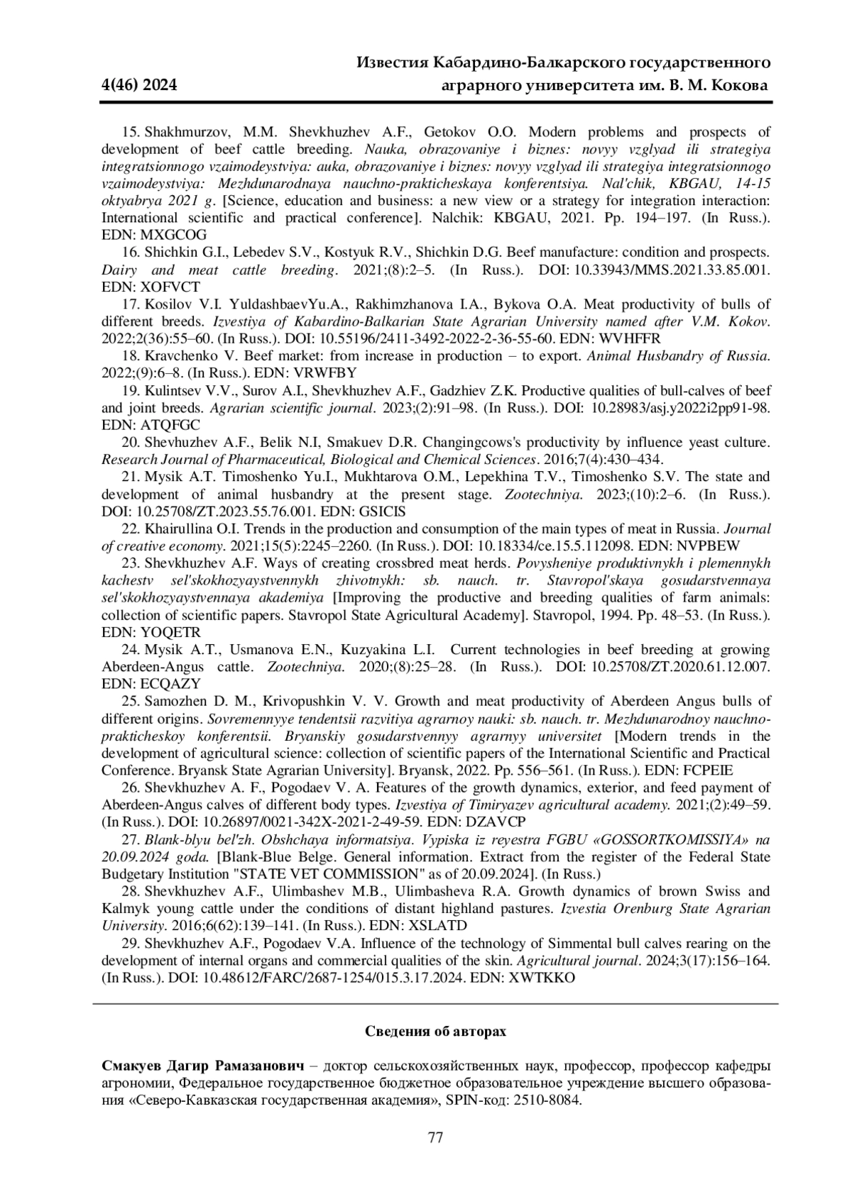 15. Шахмурзов М. М. Шевхужев А. Ф., Гетоков О. О. Современные проблемы и перспективы развития мясного скотоводства // Наука, образование и бизнес: новый взгляд или стратегия интеграционного взаимодействия: Международная научно-практическая конференция. Нальчик, КБГАУ, 14-15 октября 2021 г. С. 194-197. EDN: MXGCOG