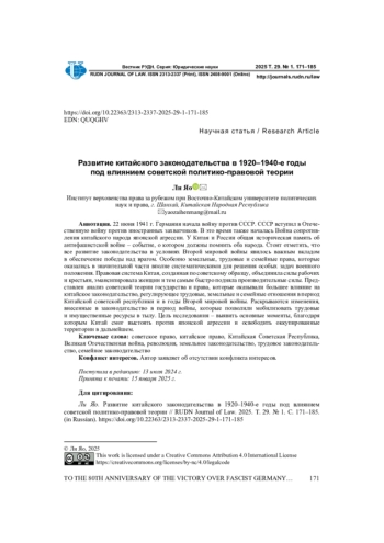 22 июня 1941 г. Германия начала войну против СССР. СССР вступил в Отечественную войну против иностранных захватчиков. В это время также началась Война сопротивления китайского народа японской агрессии. У Китая и России общая историческая память об антифашистской войне - событие, о котором должны помнить оба народа. Стоит отметить, что все развитие законодательства в условиях Второй мировой войны явилось важным вкладом в обеспечение победы над врагом. Особенно земельные, трудовые и семейные права, которые оказались в значительной части вполне систематическими для решения особых задач военного положения. Правовая система Китая, созданная по советскому образцу, объединила силы рабочих и крестьян, эмансипировала женщин и тем самым быстро подняла производительные силы. Представлен анализ советской теории государства и права, которые оказывали большее влияние на китайское законодательство, регулирующее трудовые, земельные и семейные отношения в период Китайской советской республики и в годы Второй мировой войны. Раскрываются изменения, внесенные в законодательство в период войны, которые позволили мобилизовать трудовые и имущественные ресурсы в тылу. Цель исследования - выявить основные моменты, благодаря которым Китай смог выстоять против японской агрессии и освободить оккупированные территории в дальнейшем.