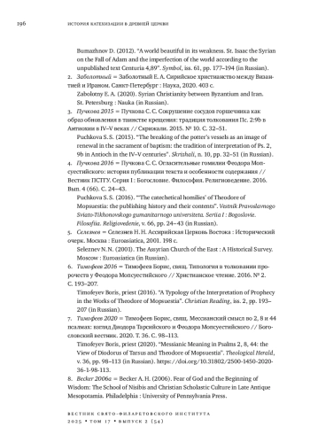 6. Тимофеев Борис, свящ. Типология в толковании пророчеств у Феодора Мопсуестийского // Христианское чтение. 2016. № 2. С. 193-207.