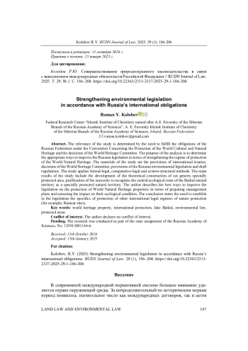 Актуальность исследования обусловлена необходимостью выполнения обязательств Российской Федерации по Конвенции об охране всемирного культурного и природного наследия и решений Комитета всемирного наследия. Цель проведенного анализа - определение оптимальных способов совершенствования российского законодательства в части закрепления режима охраны всемирного природного наследия. Материалами исследования выступают положения международных договоров, решения Комитета всемирного наследия, положения российского природоохранного законодательства и проекты нормативных актов. В исследовании использованы формально-юридический, сравнительно-правовой и системно-структурный методы. К основным результатам исследования относится разработка теоретической конструкции особо охраняемой территории sui generis, обоснование необходимости признания центральной экологической зоны Байкальской природной территории особо охраняемой природной территорией. Описываются оптимальные пути совершенствования законодательства в вопросах охраны объектов всемирного природного наследия в части подготовки планов управления ими и оценки воздействия на их экологическое состояние. В заключении констатируется необходимость закрепления в законодательстве особенностей охраны и других международно-правовых режимов охраны природы (например, рамсарских угодий).