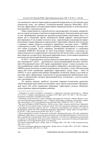 В современной международной нормативной системе большое внимание уделяется охране окружающей среды. За непродолжительный по историческим меркам период появилось значительное число как международных договоров, так и актов так называемого мягкого права природоохранной направленности. Положения таких документов носят, как правило, несамоисполнимый характер (Marochkin, 2021), поэтому эффективность их реализации зависит преимущественно от качества имплементационного законодательства.