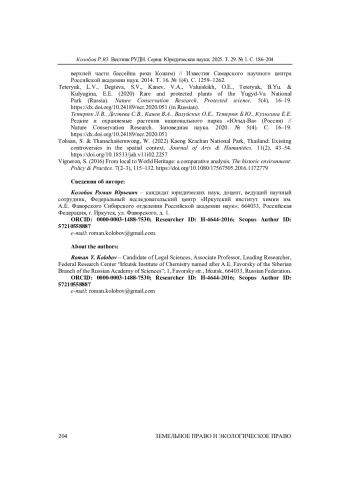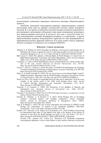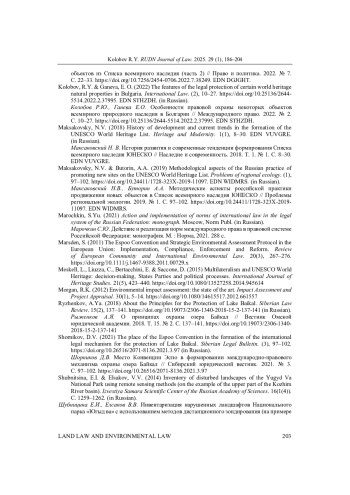 11. 	Колобов Р.Ю., Дицевич Я.Б., Ганева Е.О., Шорников Д.В. Проблемы сохранения международно-правового статуса озера Байкал в свете анализа практики исключения объектов из Списка всемирного наследия (часть 2) // Право и политика. 2022. № 7. С. 22-33. DOI: 10.7256/2454-0706.2022.7.38249 EDN: DGJGHT
