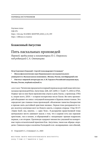 Читателям предлагается первый перевод на русский язык пяти пасхальных проповедей блж. Августина: 228, 227, 229A (= Guelf. 7), 255A и 376A. Первые три из них были произнесены утром в день Пасхи, а проповедь 376A и, скорее всего, 255A - в первое воскресенье после Пасхи. Все пять проповедей объединяет их связь с ситуацией вхождения в Церковь новых членов. Это определяет две главные темы проповедей: объяснение таинства Евхаристии и призыв жить достойной христиан жизнью. Первая тема раскрывается через экзегезу ключевых мест из Нового завета, в первую очередь 1 Кор 10:17: «Один Хлеб; мы, многие, - одно Тело». В раскрытии нравственной темы центральное место занимает мысль о том, что в церкви есть как хорошие христиане, так и плохие, и обращенный к «младенцам» призыв подражать первым, а не вторым. Проповеди содержат множество указаний на конкретные черты огласительной практики блж. Августина, такие как обряды «передачи» Символа веры и молитвы Господней и их « возвращения» или обычай, требующий, чтобы новокрещеные стояли за богослужением с покрытыми головами до 8-го дня. Это делает данные проповеди ценным источником как по истории катехизации, так и по истории Церкви вообще. Перевод снабжен вступлением и историко-филологическими комментариями. Наибольшую научную ценность имеет приложение, содержащее реконструкцию латинского текста проповеди 228 по изданию мавристов и двум рукописям: Saint-Mihiel, Bibliothèque municipale, Z 20 (X в) и Cassino, Biblioteca statale del monumento nazionale di Montecassino, 17 (XI в.). Приложение фиксирует все разночтения, имеющиеся в издании и рукописях.