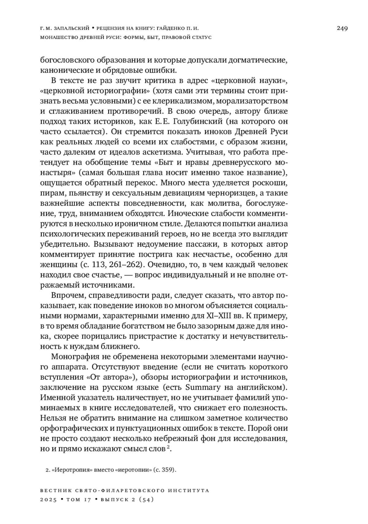 Вышла в свет новая монография доктора исторических наук, профессора Московского государственного лингвистического уни верситета Павла Ивановича Гайденко «Монашество Древней Руси: формы, быт, правовой статус» (2024). Автор — специалист по истории домонгольской Руси — известен целым рядом книг и статей о высшем церковном управлении, церковно-государственных отношениях X–XIII вв. Он изучал становление церковной административной системы после крещения Руси, место Киевского митрополита и епископов в политической жизни этого периода. В то же время в рецензируемой монографии автор признает «препятствием продвижению вперед» в историографии зацикленность на этой тематике и игнорирование вопросов антропологии и повседневности, судеб рядовых мирян, монахов и клириков (с. 5–6).