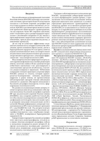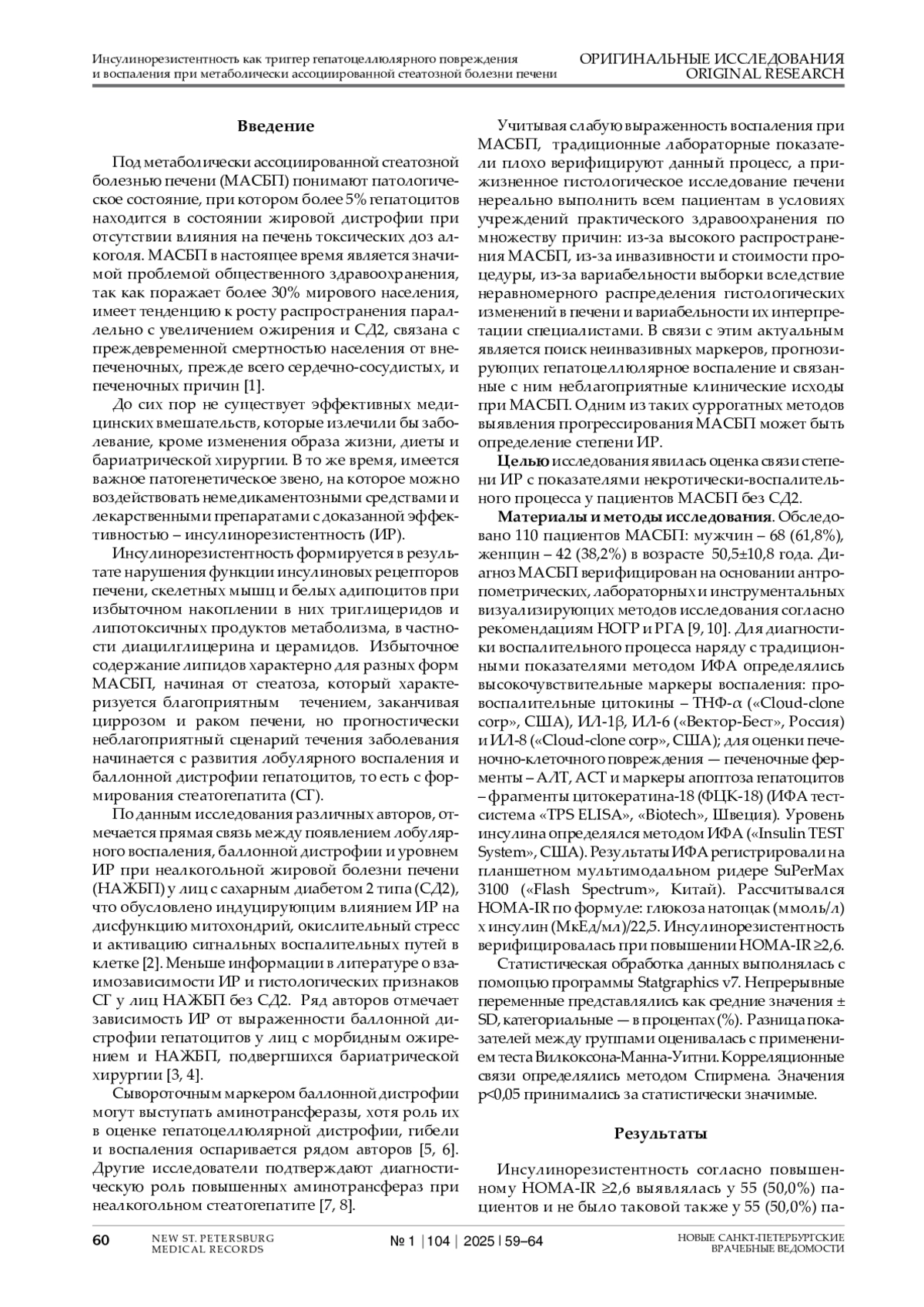 Введение. МАСБП в настоящее время является значимой проблемой общественного здравоохранения, поражает более 30% мирового населения, и связана с преждевременной смертностью населения от многих причин. Инсулинорезистентность является одним из ведущих патогенетических звеньев МАСБП. По данным различных авторов, отмечается прямая связь между появлением лобулярного воспаления, баллонной дистрофии и уровнем ИР при НАЖБП у лиц с СД2, что обусловлено индуцирующим влиянием ИР на воспаление. У пациентов c МАСБП без СД2 влияние ИР на воспалительный процесс в печени остается мало изученным. Целью исследования явилась оценка связи степени ИР с показателями некротически-воспалительного процесса у пациентов МАСБП без сахарного диабета 2 типа (СД2). Материалы и методы. Обследовано 110 пациентов МАСБП: мужчин – 68 (61,8%), женщин – 42 (38,2%) в возрасте 50,5±10,8 года. Определялись традиционные печеночные тесты, а также цитокины ТНФ-α, ИЛ-1β, ИЛ-6 и ИЛ-8, фрагменты цитокератина-18 (ФЦК-18). Рассчитывался индекс HOMA-IR по формуле (натощаковая глюкоза, ммоль/л)х(натощаковый инсулин, мкМЕ/мл)/22,5. Результаты. Инсулинорезистентность согласно HOMA-IR ≥2,6 выявлялась у 55 (50,0%) пациентов и не было таковой также у 55 (50,0%) пациентов. При сравнении лабораторных показателей при МАСБП с нормальным и повышенным HOMA-IR выявлялись достоверно более высокие уровни ФЦК-18, АЛТ, АСТ, ИЛ-1β и ИЛ-6, - у пациентов с наличием ИР. Такая же закономерность отмечалась в отношении показателей углеводного и липидного обменов. HOMA-IR продемонстрировал достоверные корреляционные связи с ФЦК-18, АСТ, с числом лимфоцитов и моноцитов периферической крови. Заключение. У 50,0% пациентов МАСБП до формирования СД2 имелся высокий уровень HOMA-IR, подтверждавший инсулинорезистентность. Ее наличие сопровождалось достоверным ростом биомаркеров гепатоцеллюлярной гибели и воспаления, что прогнозировало более тяжелое течение МАСБП.