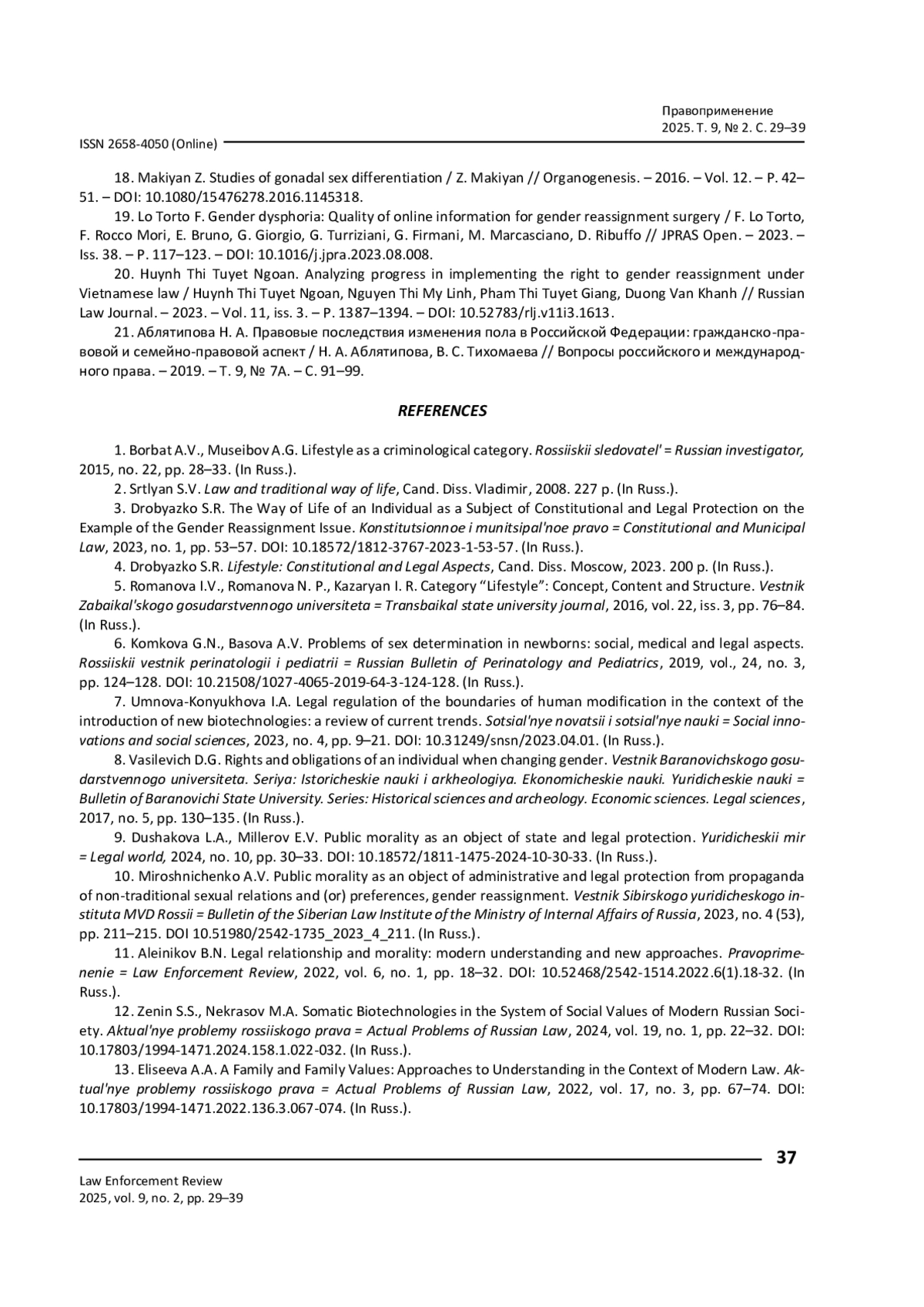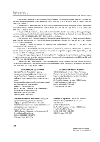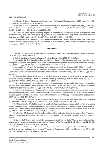 21. Аблятипова Н. А. Правовые последствия изменения пола в Российской Федерации: гражданско-правовой и семейно-правовой аспект / Н. А. Аблятипова, В. С. Тихомаева // Вопросы российского и международного права. - 2019. - Т. 9, № 7A. - С. 91-99.