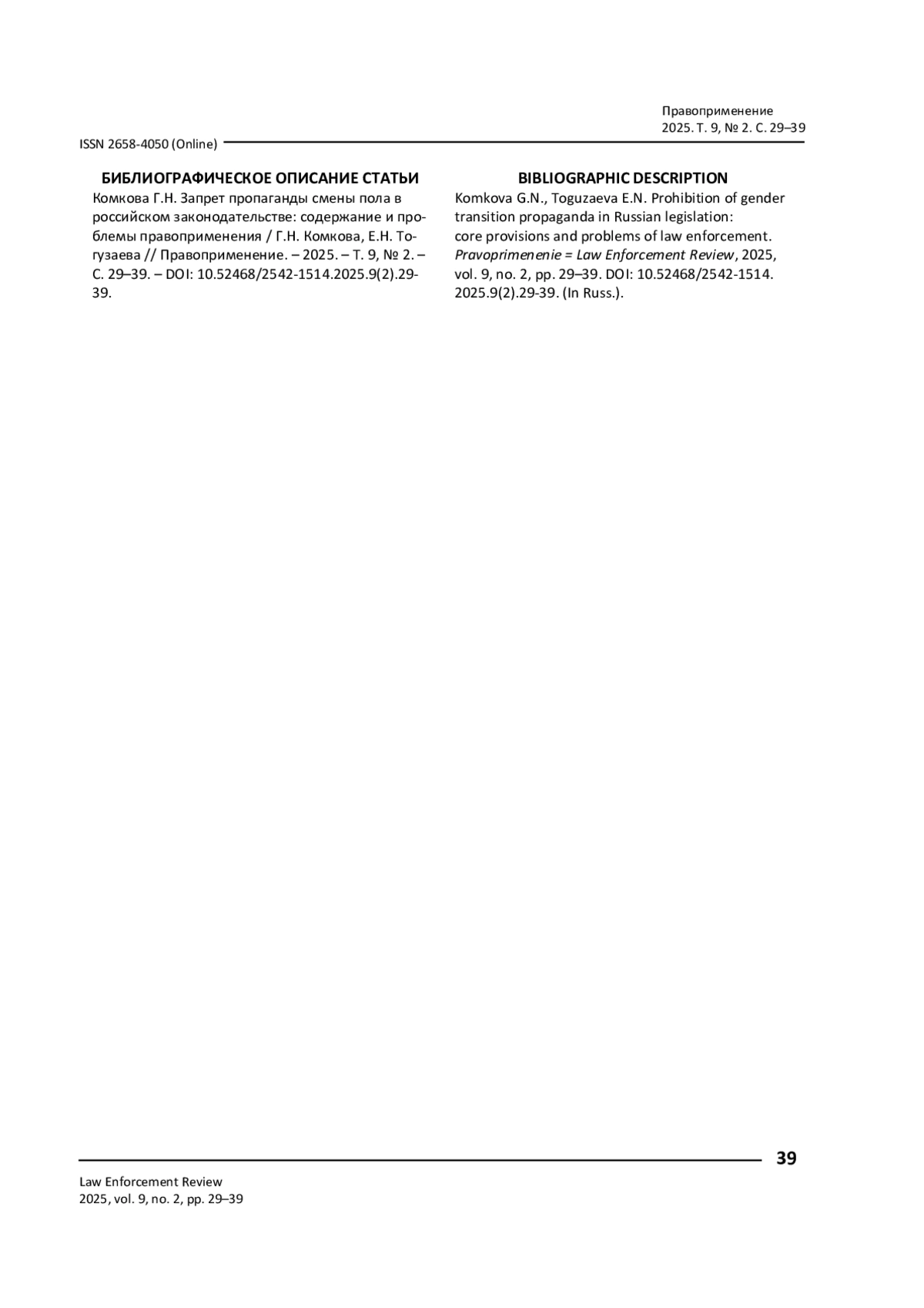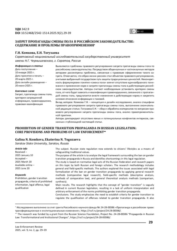 Выявляются проблемы правового регулирования запрета пропаганды смены пола по российскому законодательству. Посредством общенаучных и частнонаучных методов авторами рассмотрены проблемы, связанные с правовым оформлением такого запрета. Отмечается, что образ жизни россиян стал объектом правового регулирования, учитывая выбранный государством путь защиты традиционных ценностей. Неконкретность формулировки понятия «смена пола» влечет отсутствие единообразного понимания и применения норм о запрете пропаганды смены пола в действующем российском законодательстве. Авторы считают необходимым установить критерии смены пола, от чего будет зависеть и квалификация правонарушения, связанного с пропагандой смены пола, предлагается внести изменения в действующую норму и закрепить условия отнесения информации к таковой.
