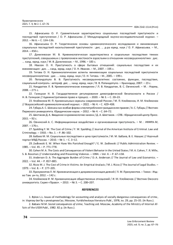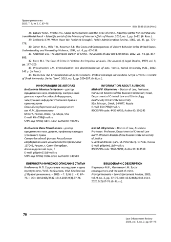 28. Бабаев М. М. Социальные последствия и цена преступности / М. М. Бабаев, В. Е. Квашис // Научный портал МВД России. - 2010. - № 1. - С. 3-12.