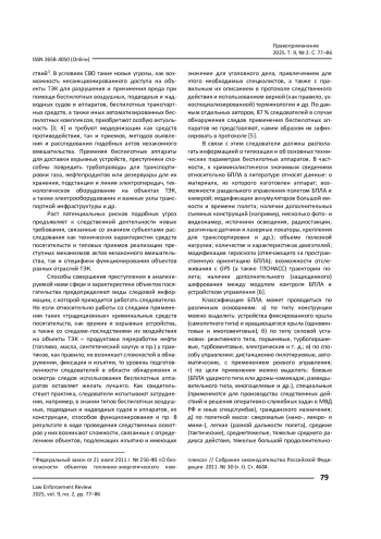 Энергетические системы всех стран мира в условиях вооруженных конфликтов всё чаще подвергаются внешним физическим атакам, в том числе с использованием передовых технологий (например, беспилотных аппаратов). Поскольку от функционирования таких систем зависит национальная безопасность страны, актуализируются вопросы своевременного пресечения подобных атак и выявления лиц, их осуществивших. Передовая роль в данном процессе отводится криминалистическим средствам, приемам и методам расследования данных криминальных событий. В статье выделяются проблемные аспекты, связанные с характеристиками объектов энергетического комплекса, технологиями их функционирования, типами беспилотных аппаратов и их конструктивными особенностями, а также современными техническими и кадровыми возможностями правоохранительных органов по обеспечению процесса обнаружения, фиксации и изъятия следовой информации.