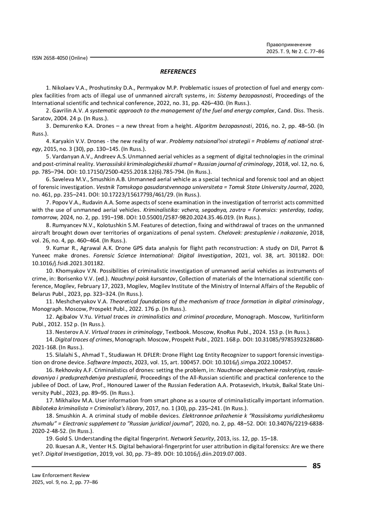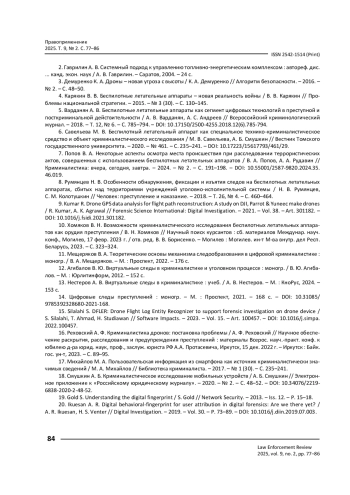 5. Варданян А. В. Беспилотные летательные аппараты как сегмент цифровых технологий в преступной и посткриминальной действительности / А. В. Варданян, А. С. Андреев // Всероссийский криминологический журнал. - 2018. - Т. 12, № 6. - С. 785-794. - https://doi.org/10.17150/2500-4255.2018.12(6).785-794.