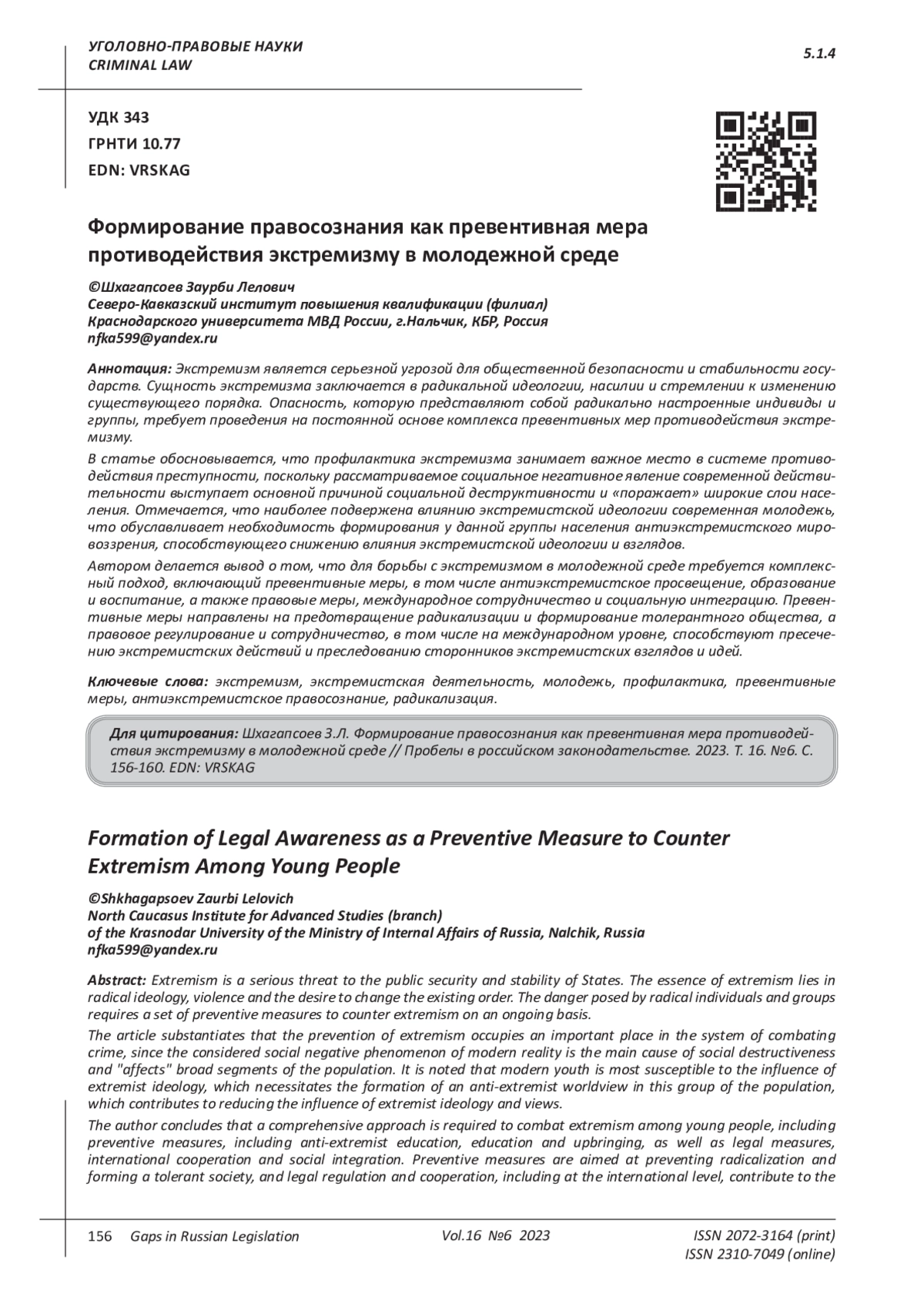 Krymshokalov A.Z., Thagalegov A.A. Issues of preventing radicalism and extremism among youth // Eurasian Legal Journal. 2021. No. 10 (161).