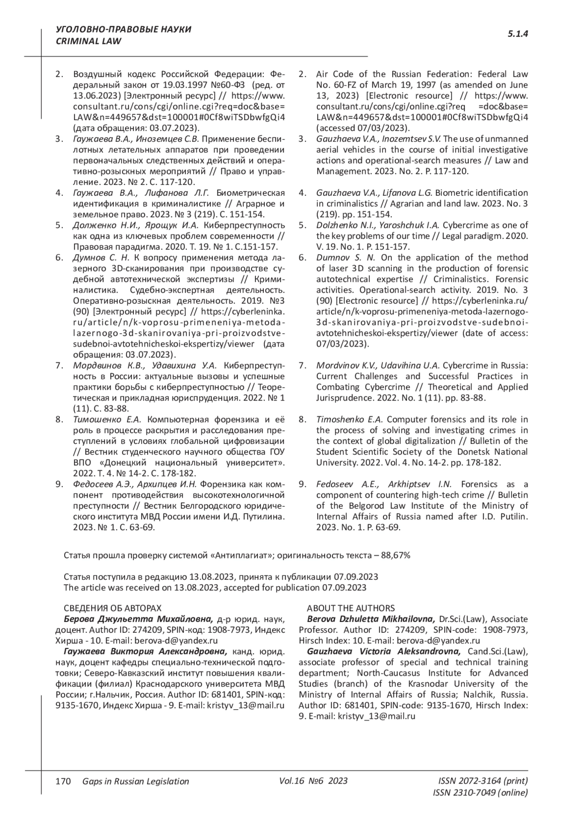 3. Гаужаева В.А., Иноземцев С.В. Применение беспилотных летательных аппаратов при проведении первоначальных следственных действий и оперативно-розыскных мероприятий // Право и управление. 2023. № 2. С. 117-120.