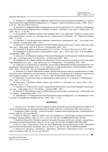 11. Бондарь Н. С. Информационно-цифровое пространство в конституционном измерении: из практики Конституционного Суда Российской Федерации / Н. С. Бондарь // Журнал российского права. - 2019. - № 11. - С. 25-42. - https://doi.org/10.12737/jrl.2019.11.2.