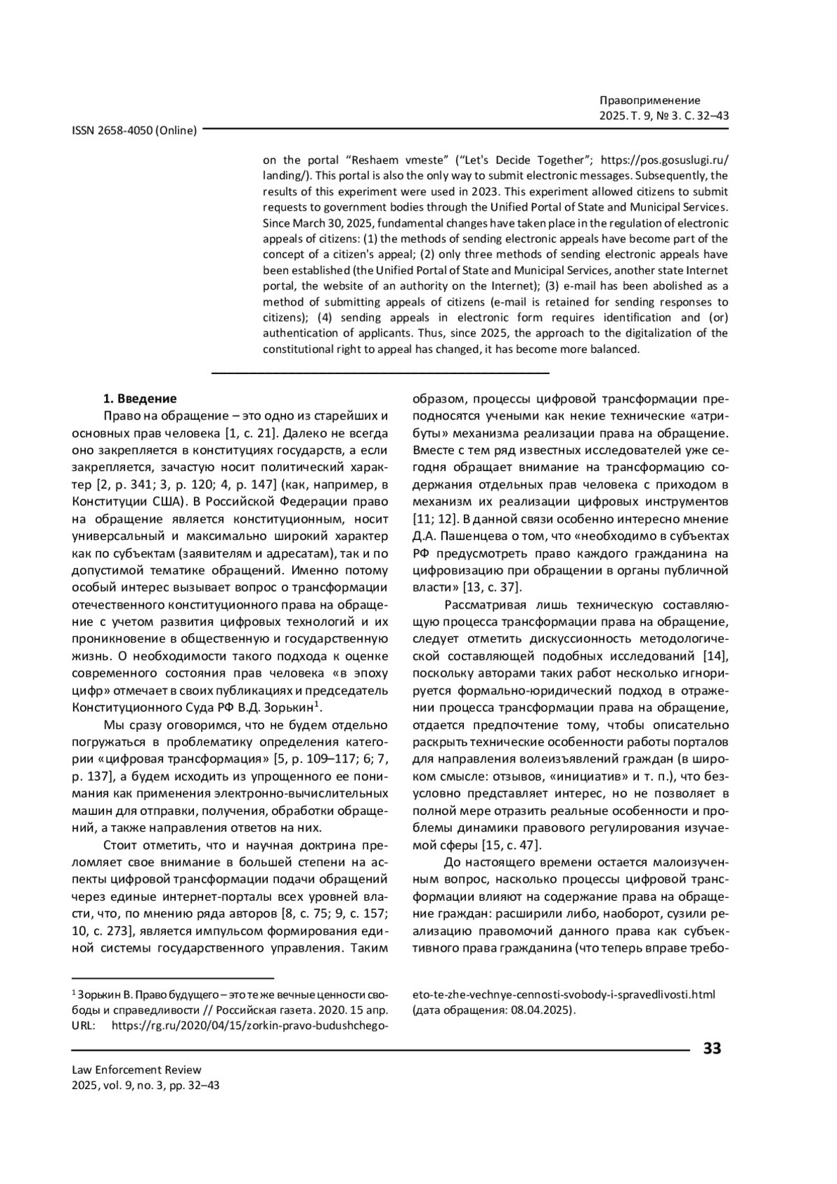 Цифровая трансформация конституционного права на обращение началась с либерального подхода (были установлены упрощенные требования к обращениям в электронной форме) и до 2025 г. характеризовалась увеличением числа электронных каналов подачи обращений граждан. Однако с 30 марта 2025 г. тенденция сменилась. Были упорядочены электронные способы подачи обращений, а их отправка была обусловлена идентификацией и (или) аутентификацией заявителей. В статье анализируются следующие этапы трансформации конституционного права на обращение: легализация обращений в электронной форме, появление специализированных государственных порталов для подачи обращений, появление исключительно электронных форм обращений граждан, использование Единого портала государственных и муниципальных услуг для подачи обращений, а также новеллы конца 2024 г., упорядочившие способы подачи электронных обращений.