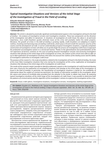 Статья посвящена практически значимым и основополагающим аспектам в расследовании мошенничества в сфере кредитования - анализу следственных версий и следственных ситуаций. Эти два составляющих задают направление расследования и влияют на его динамичность. В ситуациях расследования кредитного мошенничества сказанное приобретает особую важность, поскольку кредитные мошенники быстро устраняют следы преступления и оперативно реализуют похищенное имущество. Более того, рост преступлений в сфере кредитования растет стремительными темпами, кредитные мошенники адаптируются к современным реалиям, изобретают и совершенствуют способы хищения кредитных средств, что создает угрозу как экономической безопасности страны, так и развитию торговли. Верное понимание типичных следственных ситуаций, логически грамотное построение следственных версий позволит оперативно начать процесс расследования кредитного мошенничества, структурированно подойти к производству следственных действий. Благодаря обобщению и систематизации богатого опыт ученых-криминалистов по вопросу выдвижения следственных версий и оценке следственных ситуаций, складывающихся на первоначальном этапе расследования преступления, авторам настоящей статьи удалось предложить актуальную на сегодняшний момент типизацию следственных ситуаций, учитывающей реалии сферы кредитования и способности следственных органов в расследовании кредитного мошенничества. Целью исследования является: изучение проблем, связанных с расследованием мошенничества в сфере кредитования, изучение наиболее вероятных следственных ситуаций, возникающих при расследовании указанного преступления; типизация следственных ситуаций, складывающихся на первоначальном этапе расследования кредитного мошенничества. Результаты проведенного исследования позволили выявить проблемные аспекты в расследовании кредитного мошенничества и разработать авторские критерии по типизации следственных ситуаций, складывающихся на первоначальном этапе расследования мошенничества в сфере кредитования. В частности, за основу классификации следственных ситуаций взято: наличие информации о субъекте преступного посягательства; совокупность имеющихся у следователя сведений о характере и объеме недостоверных данных, предоставленных от злоумышленника кредитору для получения ссудных средств. Посредством анализа типичных следственных ситуаций первоначального этапа расследования кредитного мошенничества удалось определить как закономерности преступной деятельности, так и алгоритм действий следователя по организации расследования преступления.