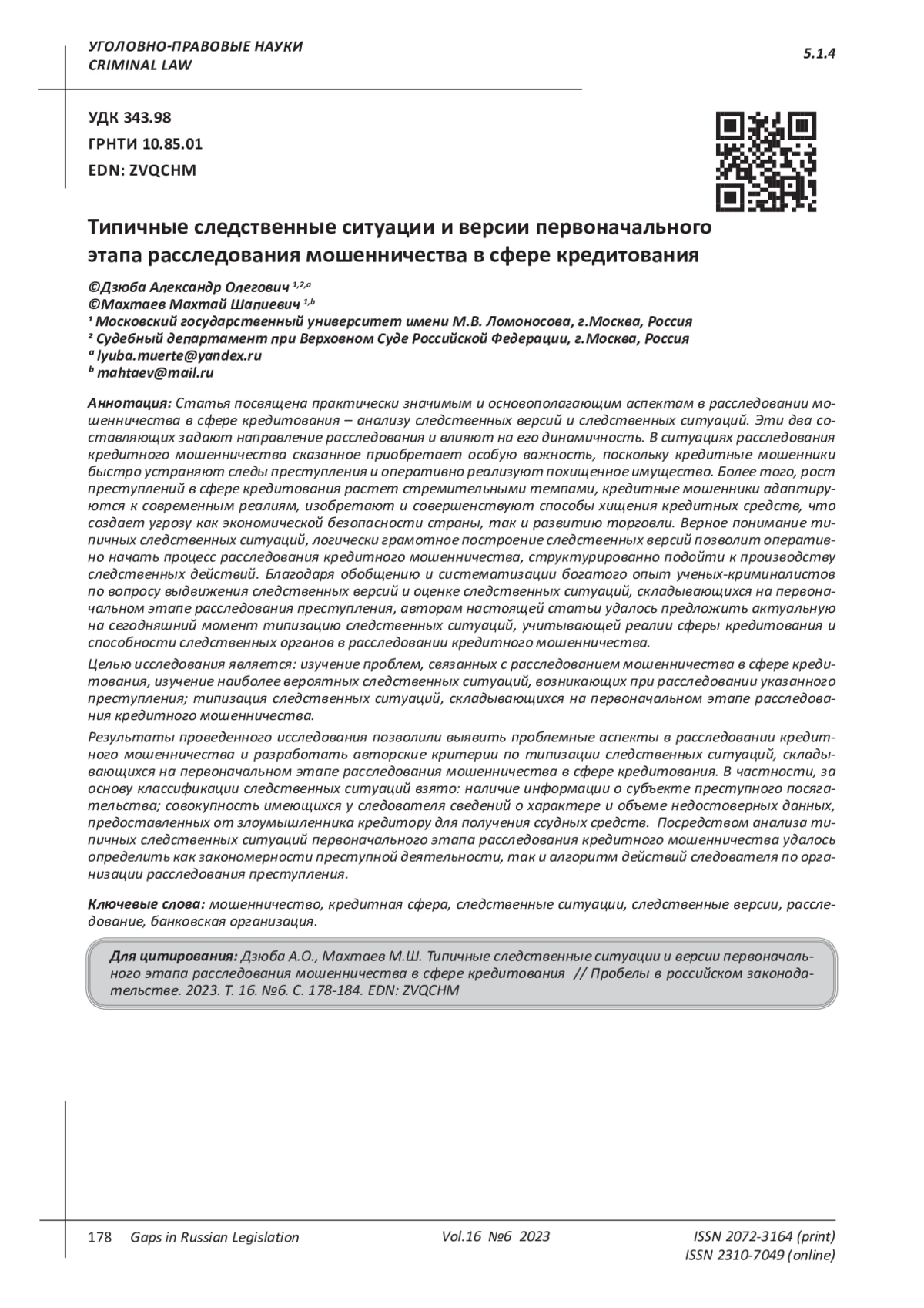 Tagirov R. A. Investigative versions on cases of fraud investigation in the sphere of crediting of legal entities and individual entrepreneurs // A Russian investigator. - 2021. - No. 9. - p. 27.