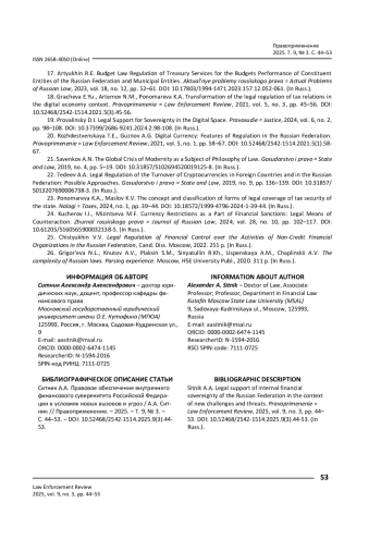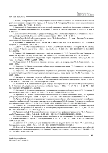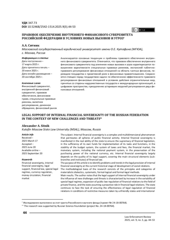 СИТНИК А. А. ПРАВОВОЕ ОБЕСПЕЧЕНИЕ ВНУТРЕННЕГО ФИНАНСОВОГО СУВЕРЕНИТЕТА РОССИЙСКОЙ ФЕДЕРАЦИИ В УСЛОВИЯХ НОВЫХ ВЫЗОВОВ И УГРОЗ // ПРАВОПРИМЕНЕНИЕ. 2025. ТОМ 9, № 3