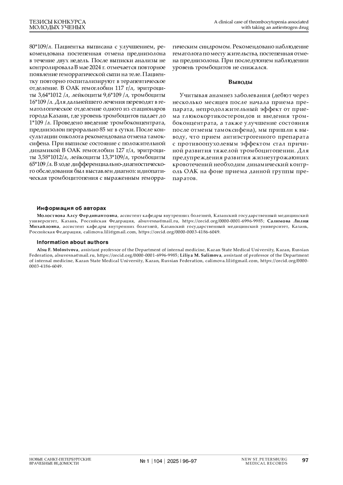 Представлен клинический случай тромбоцитопении на фоне приема антиэстрогенного препарата у пациента, получающего лечение в связи с раком молочной железы.