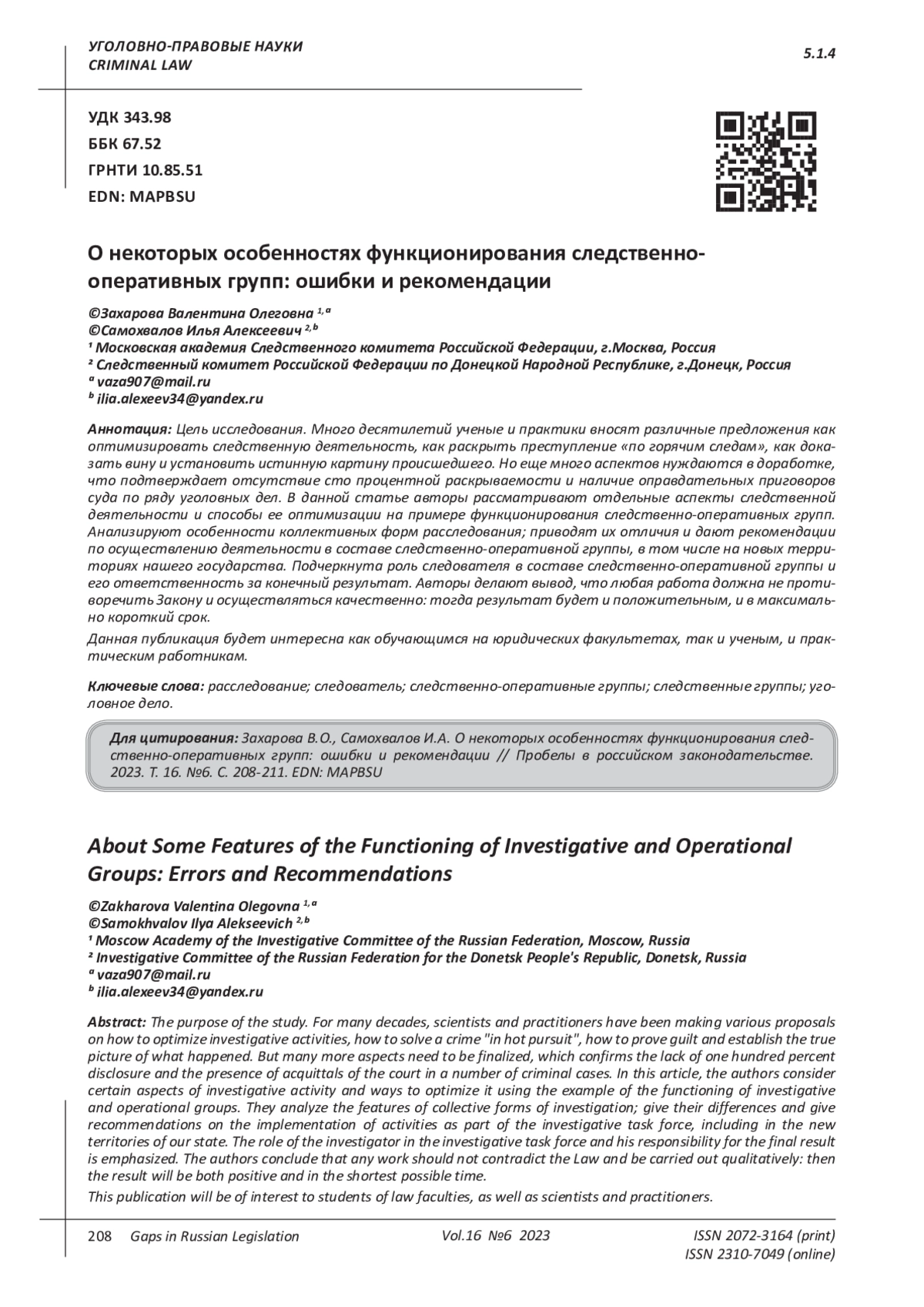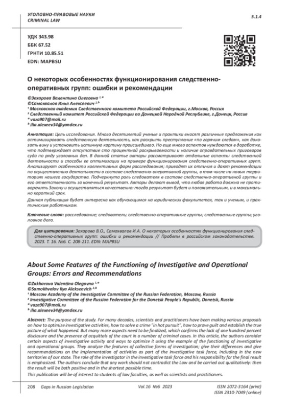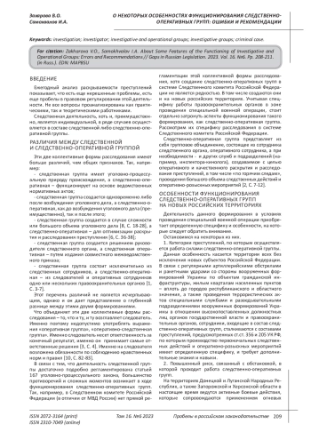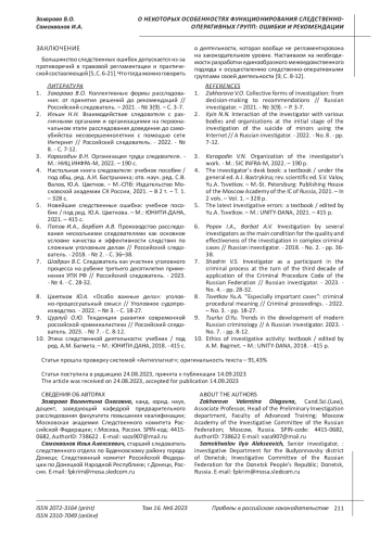 1. 	Захарова В.О. Коллективные формы расследования: от принятия решений до рекомендаций // Российский следователь. - 2021. - № 3(9). - С. 3-7. EDN: KSGDHE