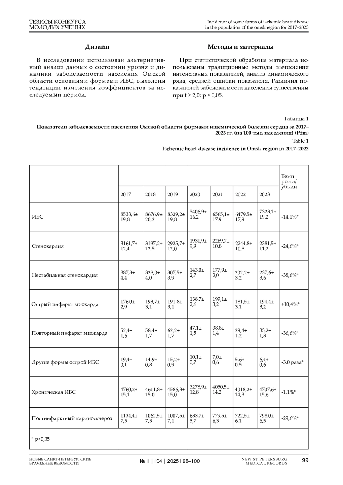 Статья: ЗАБОЛЕВАЕМОСТЬ НАСЕЛЕНИЯ ОМСКОЙ ОБЛАСТИ НЕКОТОРЫМИ ФОРМАМИ ИШЕМИЧЕСКОЙ БОЛЕЗНИ СЕРДЦА ЗА 2017–2023 ГГ. (2025)