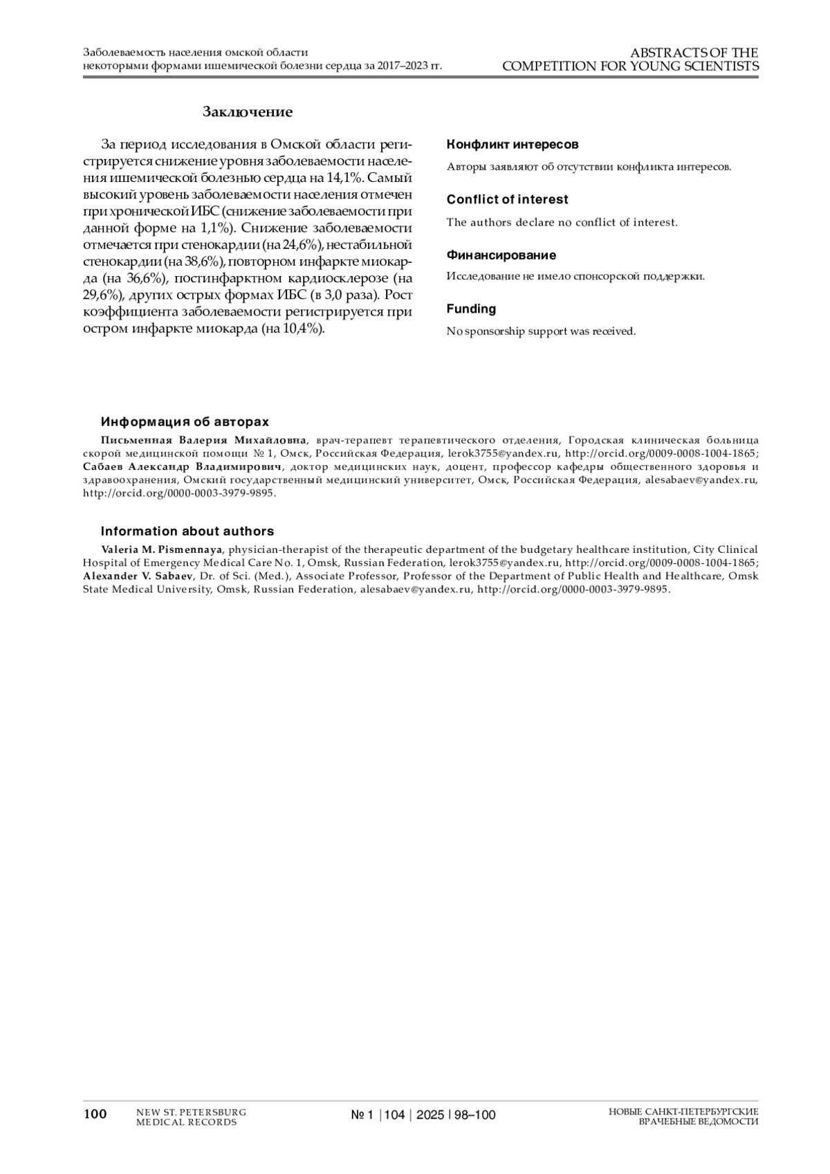 ПИСЬМЕННАЯ В. М., САБАЕВ А. В. ЗАБОЛЕВАЕМОСТЬ НАСЕЛЕНИЯ ОМСКОЙ ОБЛАСТИ НЕКОТОРЫМИ ФОРМАМИ ИШЕМИЧЕСКОЙ БОЛЕЗНИ СЕРДЦА ЗА 2017–2023 ГГ. // НОВЫЕ САНКТ-ПЕТЕРБУРГСКИЕ ВРАЧЕБНЫЕ ВЕДОМОСТИ. 2025. № 1, ТОМ 104