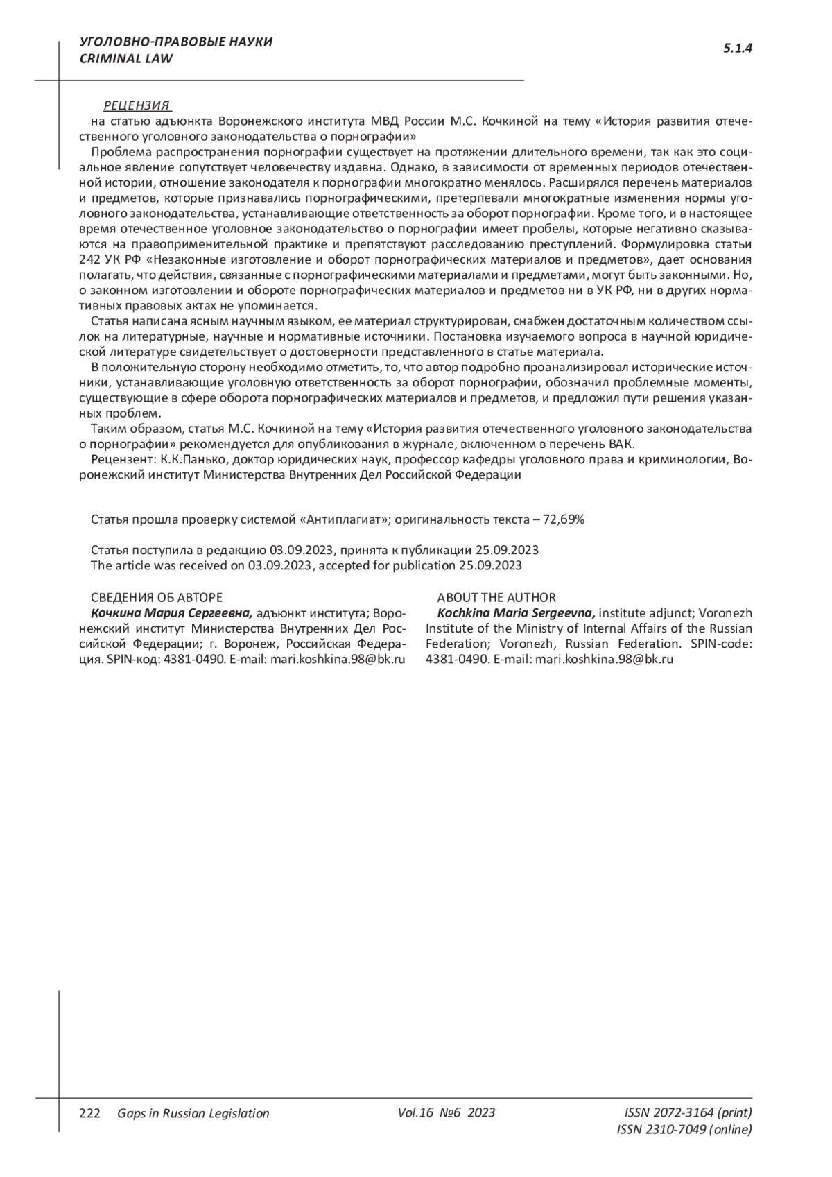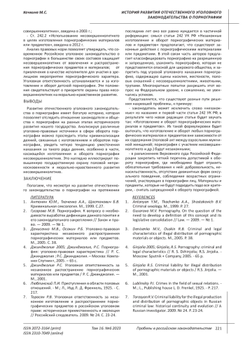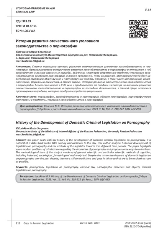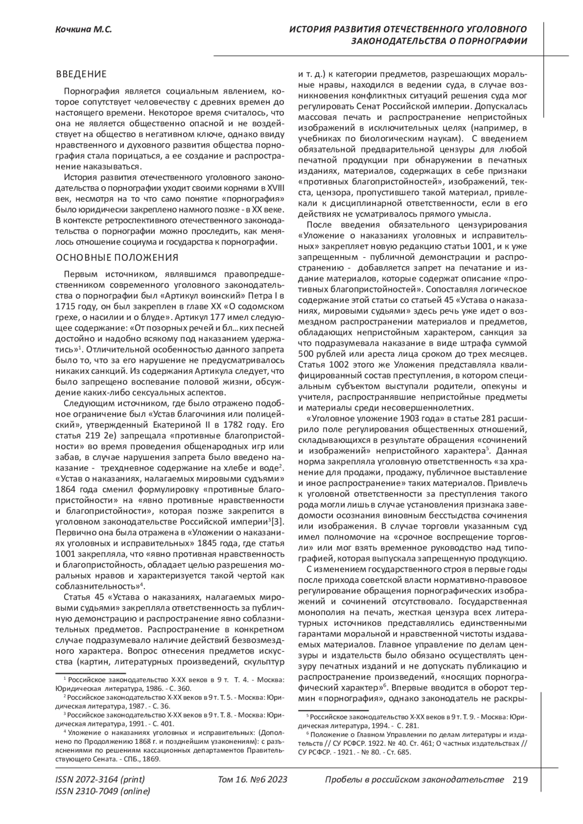 КОЧКИНА М. С. ИСТОРИЯ РАЗВИТИЯ ОТЕЧЕСТВЕННОГО УГОЛОВНОГО ЗАКОНОДАТЕЛЬСТВА О ПОРНОГРАФИИ // ПРОБЕЛЫ В РОССИЙСКОМ ЗАКОНОДАТЕЛЬСТВЕ. 2023. Т. 16 № 6