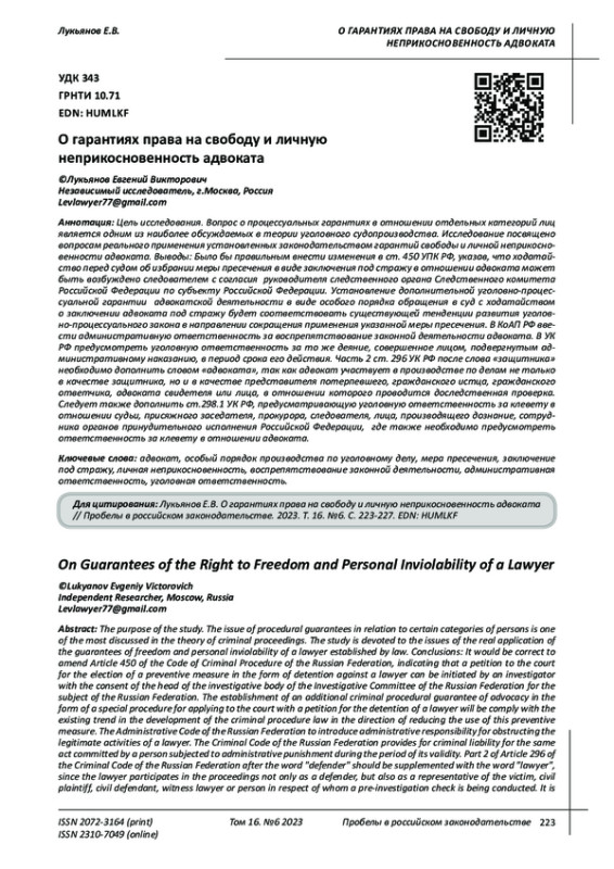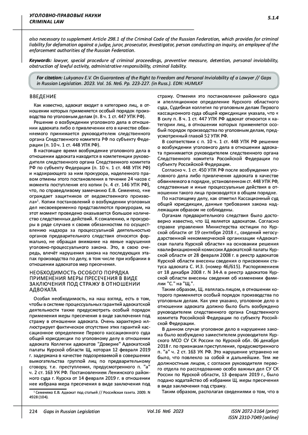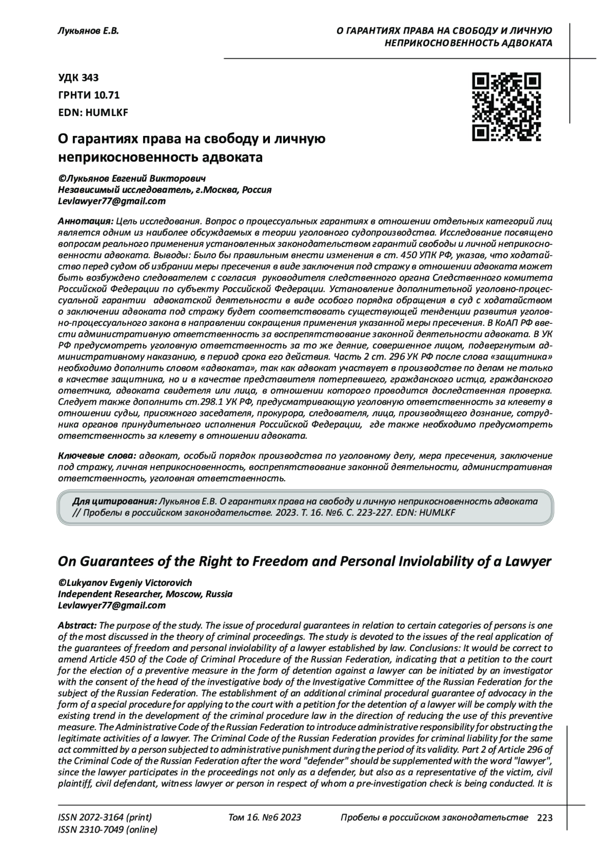 ЛУКЬЯНОВ Е. В. О ГАРАНТИЯХ ПРАВА НА СВОБОДУ И ЛИЧНУЮ НЕПРИКОСНОВЕННОСТЬ АДВОКАТА // ПРОБЕЛЫ В РОССИЙСКОМ ЗАКОНОДАТЕЛЬСТВЕ. 2023. Т. 16 № 6