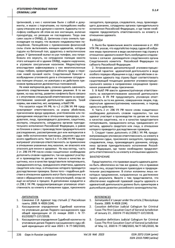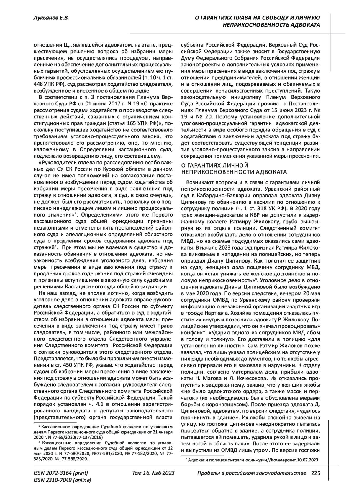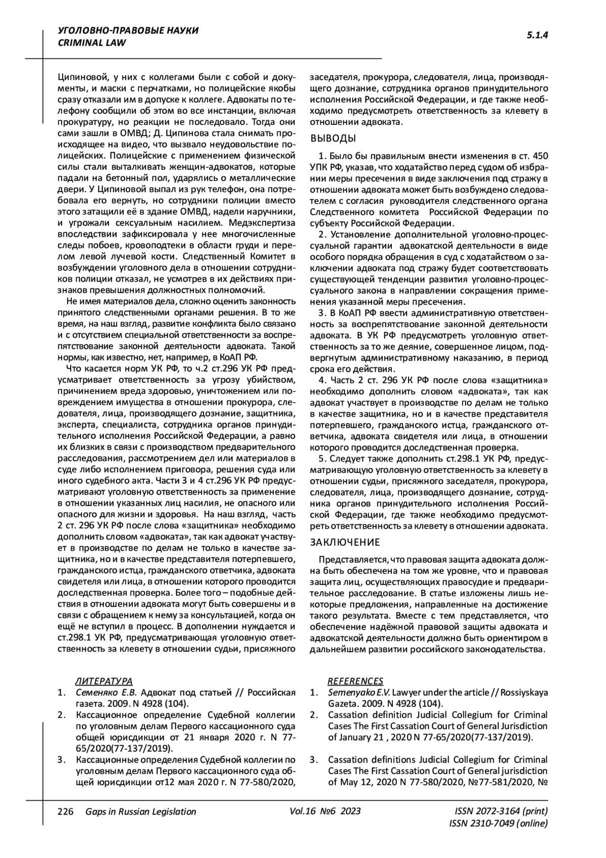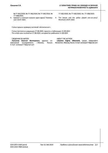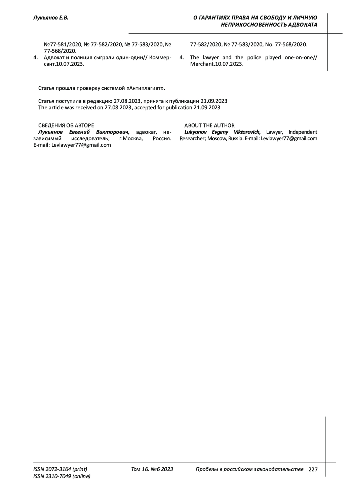 ЛУКЬЯНОВ Е. В. О ГАРАНТИЯХ ПРАВА НА СВОБОДУ И ЛИЧНУЮ НЕПРИКОСНОВЕННОСТЬ АДВОКАТА // ПРОБЕЛЫ В РОССИЙСКОМ ЗАКОНОДАТЕЛЬСТВЕ. 2023. Т. 16 № 6