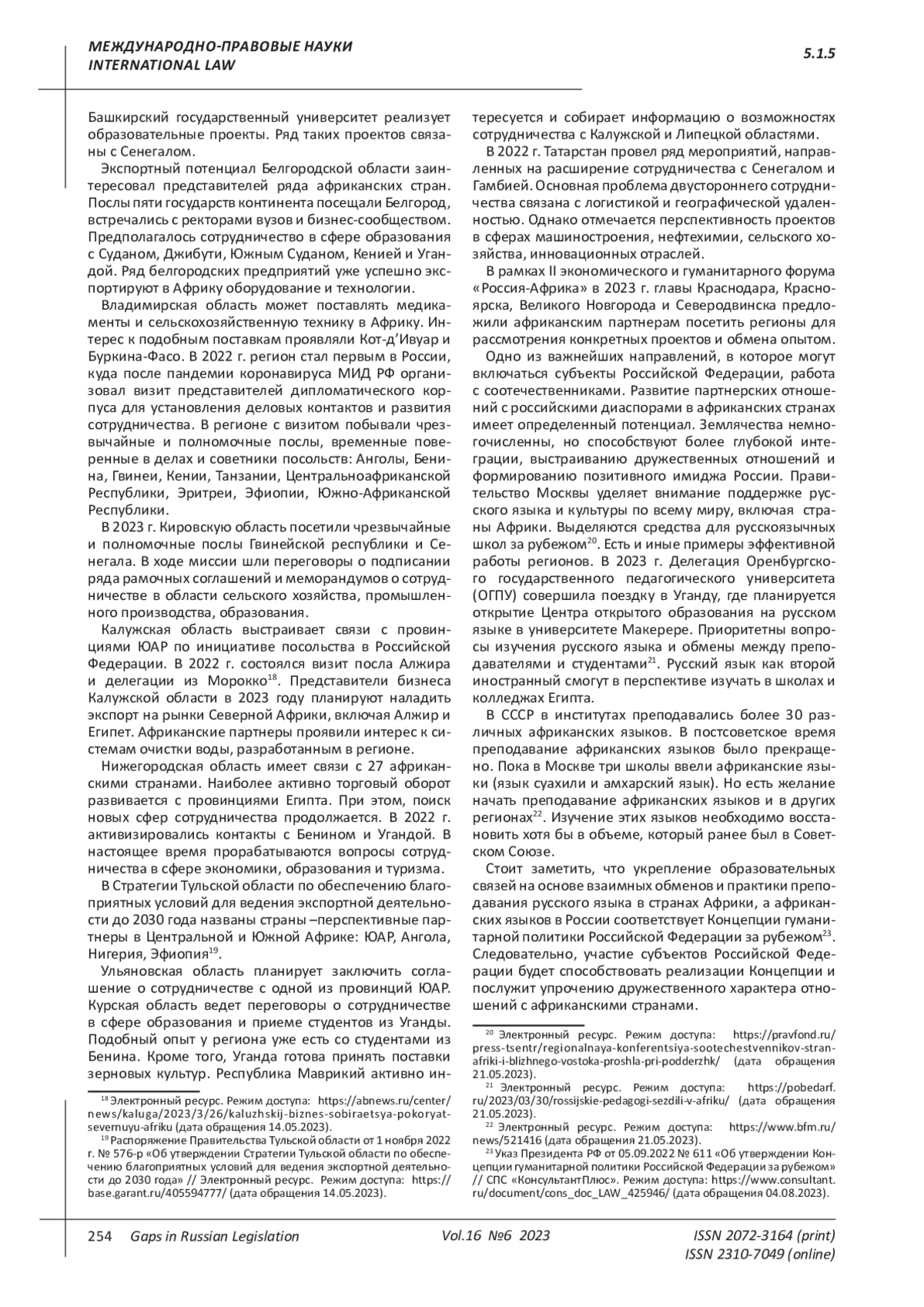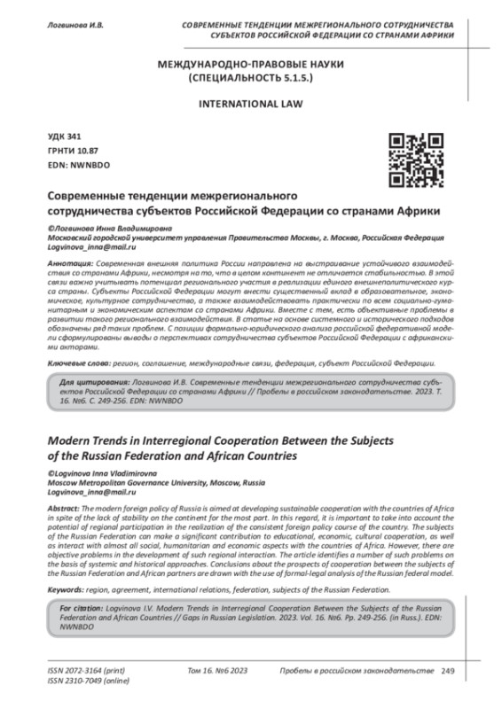 Современная внешняя политика России направлена на выстраивание устойчивого взаимодействия со странами Африки, несмотря на то, что в целом континент не отличается стабильностью. В этой связи важно учитывать потенциал регионального участия в реализации единого внешнеполитического курса страны. Субъекты Российской Федерации могут внести существенный вклад в образовательное, экономическое, культурное сотрудничество, а также взаимодействовать практически по всем социально-гуманитарным и экономическим аспектам со странами Африки. Вместе с тем, есть объективные проблемы в развитии такого регионального взаимодействия. В статье на основе системного и исторического подходов обозначены ряд таких проблем. С позиции формально-юридического анализа российской федеративной модели сформулированы выводы о перспективах сотрудничества субъектов Российской Федерации с африканскими акторами.