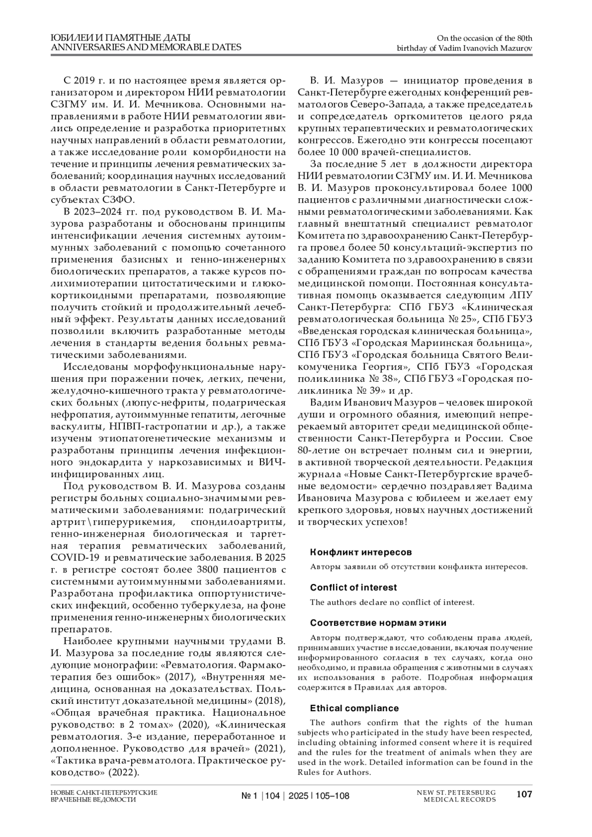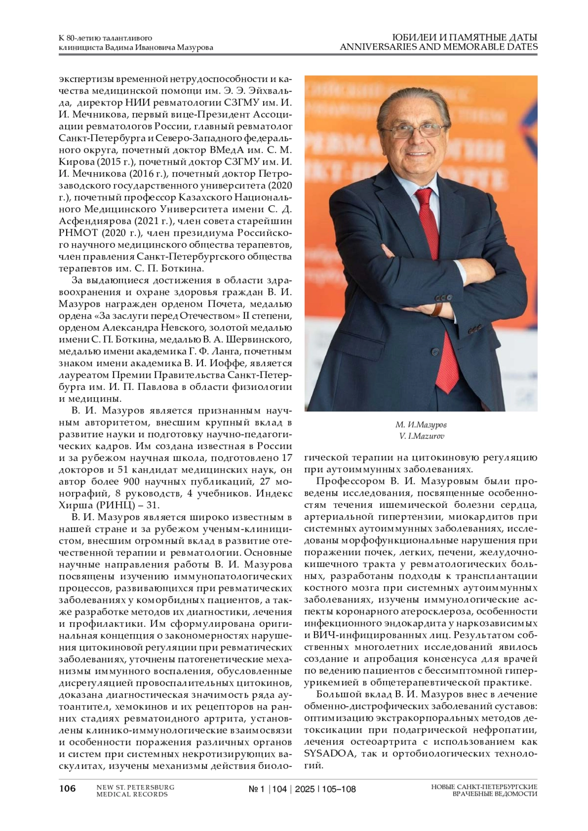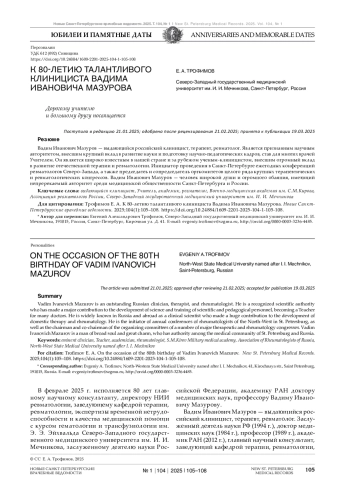 В феврале 2025 г. исполняется 80 лет главному научному консультанту, директору НИИ ревматологии, заведующему кафедрой терапии, ревматологии, экспертизы временной нетрудоспособности и качества медицинской помощи с курсом гематологии и трансфузиологии им. Э. Э. Эйхвальда Северо-Западного государственного медицинского университета им. И. И. Мечникова, заслуженному деятелю науки Российской Федерации, академику РАН доктору медицинских наук, профессору Вадиму Ивановичу Мазурову.