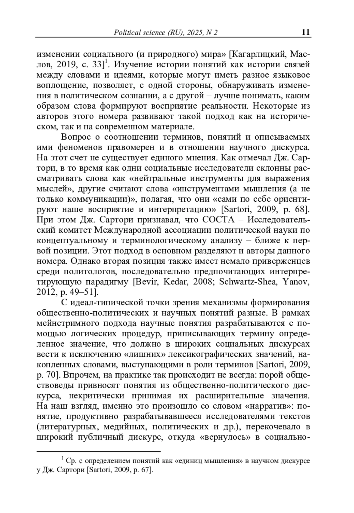 С идеал-типической точки зрения механизмы формирования общественно-политических и научных понятий разные. В рамках мейнстримного подхода научные понятия разрабатываются с помощью логических процедур, приписывающих термину определенное значение, что должно в широких социальных дискурсах вести к исключению «лишних» лексикографических значений, накопленных словами, выступающими в роли терминов [Sartori, 2009, p. 70].