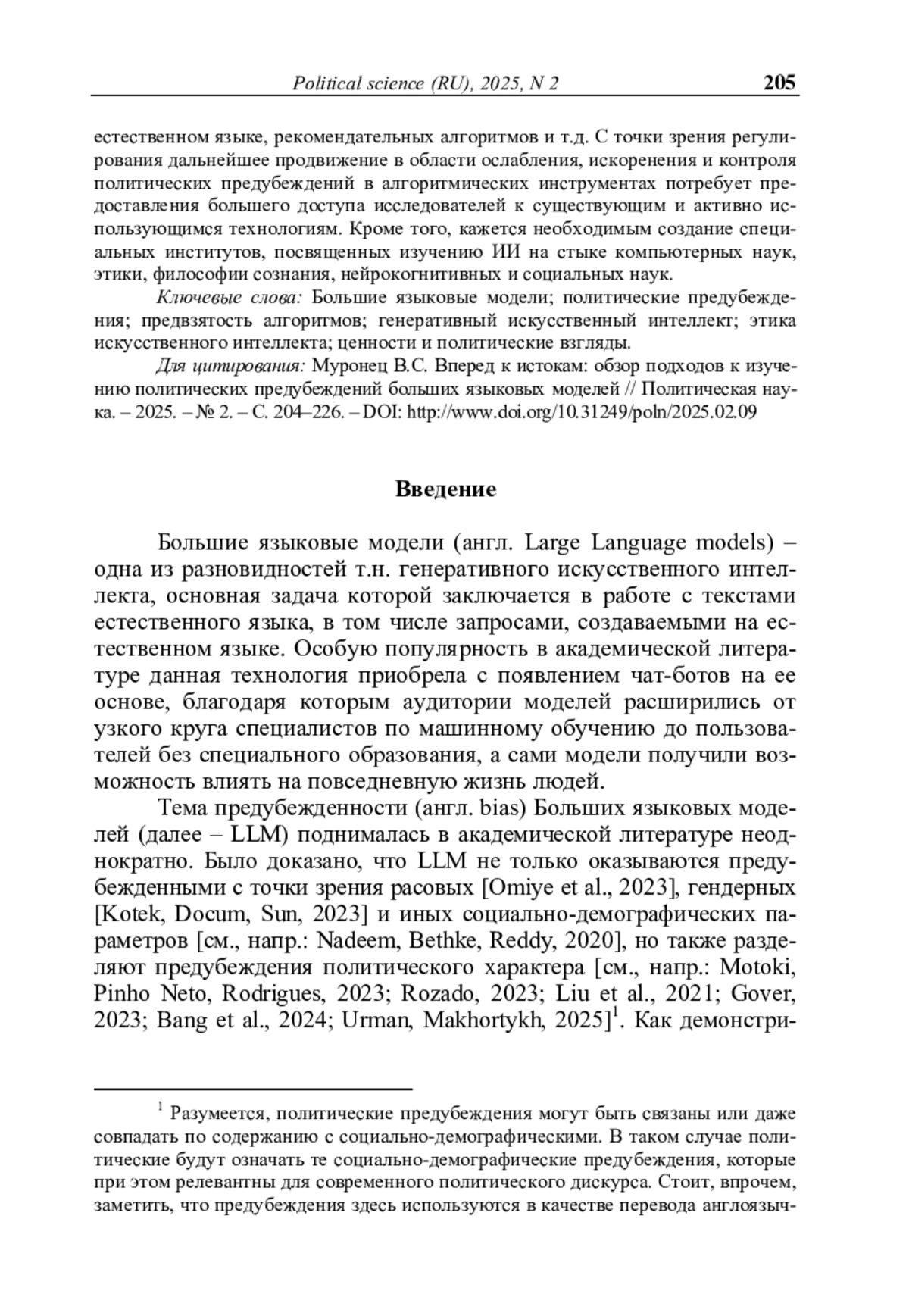 Политические предубеждения больших языковых моделей нередко становились предметом научного рассмотрения. Большинство исследователей, однако, скорее конкурирует в изобретении оригинальных способов выявлять предубеждения, нежели стремится ставить новые вопросы, с ними связанные, кроме: «Предубеждена ли эта модель политически?» и «Каков характер этого предубеждения?». Для оценки возможного влияния моделей на политическую реальность и получения ответов на некоторые вопросы регулирования необходимо также обладать способами изучения связи между предубежденностью и ее причиной. По качеству ответа на вопрос о выявлении зависимости между открытой предубежденностью и ее возможным источником я разделил подходы на три кластера: подходы, задействующие анкеты по определению политической позиции, исследования, посвященные способу составления промптов и откликов модели и их взаимосвязи, а также междисциплинарные исследования, в которых проводятся манипуляции с возможными источниками политических предубеждений больших языковых моделей. Последнее исследовательское направление кжется наиболее перспективным, несмотря на свою непопулярность на данный момент. Тем не менее продвижение в нем невозможно без тесного сотрудничества другими подходами, подпадающими под первые два кластера. К исследованиям проблемы предубеждений LLM должны привлекаться не только специалисты по компьютерным наукам, но и философы, политологи и другие специалисты в области социальных наук. Отдельного изучения также требуют политические предубеждения на стыке LLM и других технологий генеративного ИИ, в частности, технологий генерации изображений на основе промптов, составленных на естественном языке, рекомендательных алгоритмов и т. д. С точки зрения регулирования дальнейшее продвижение в области ослабления, искоренения и контроля политических предубеждений в алгоритмических инструментах потребует предоставления большего доступа исследователей к существующим и активно использующимся технологиям. Кроме того, кажется необходимым создание специальных институтов, посвященных изучению ИИ на стыке компьютерных наук, этики, философии сознания, нейрокогнитивных и социальных наук.
