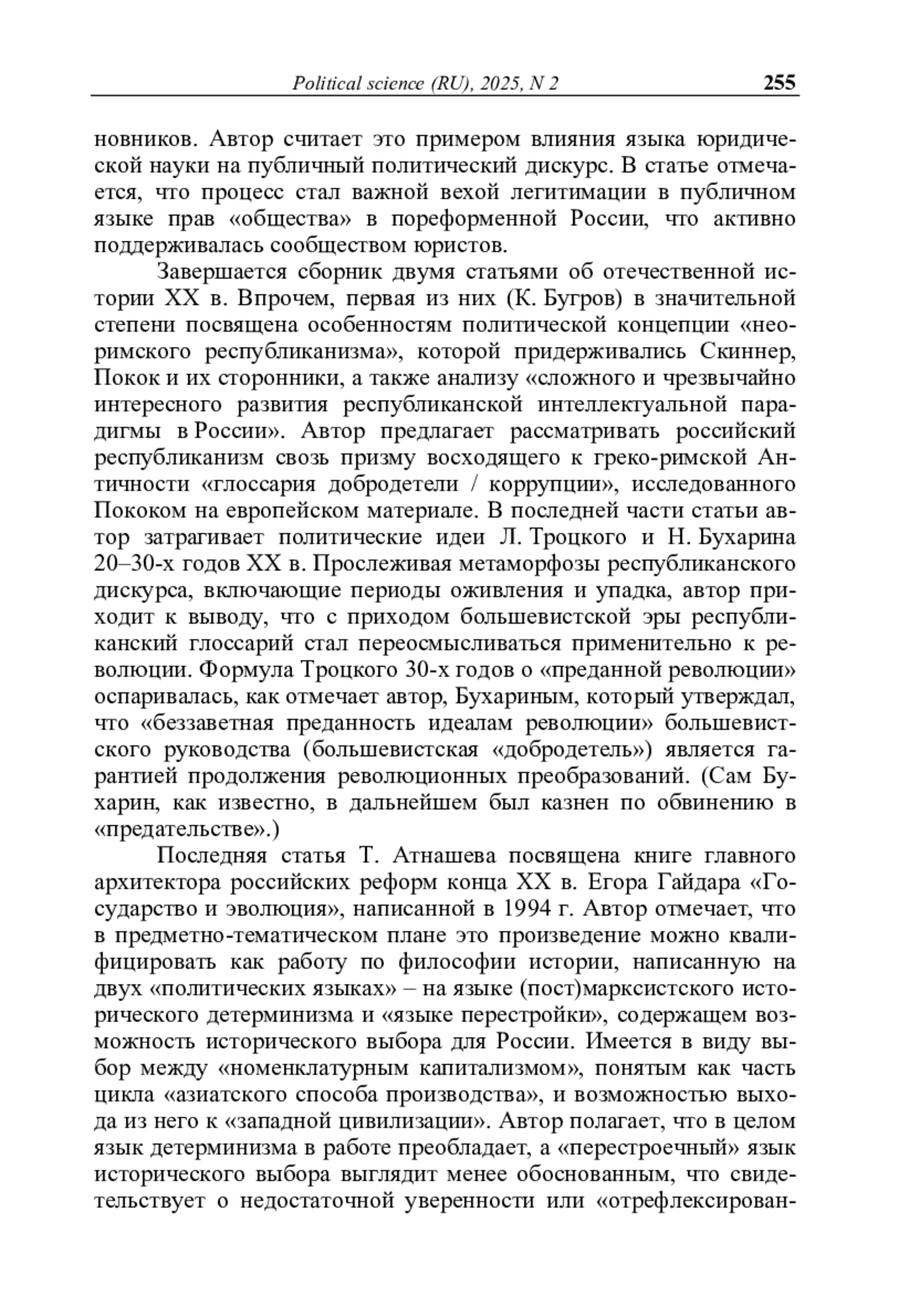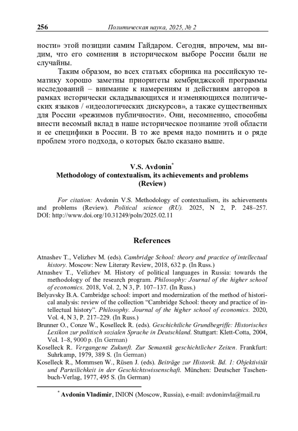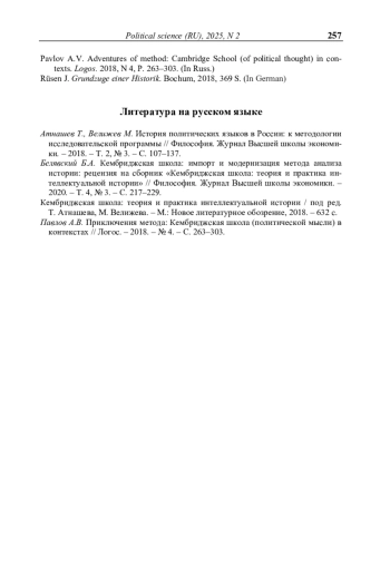 1. Атнашев Т., Велижев М. История политических языков в России: к методологии исследовательской программы // Философия. Журнал Высшей школы экономики. - 2018. - Т. 2, № 3. - С. 107-137.