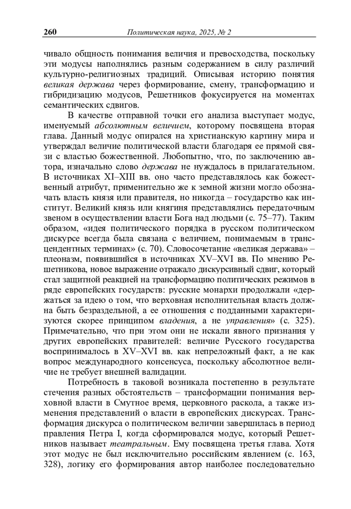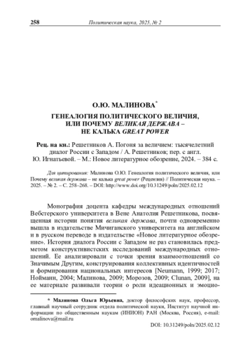 Рец. на кн.: Решетников А. Погоня за величием: тысячелетний диалог России с Западом / А. Решетников; пер. с англ. Ю. Игнатьевой. – М.: Новое литературное обозрение, 2024. – 384 с.