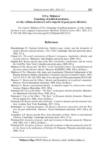 1. Малинова О.Ю. Россия и «Запад» в ХХ веке: трансформация дискурса о коллективной идентичности. - М.: РОССПЭН, 2009. - 190 с.