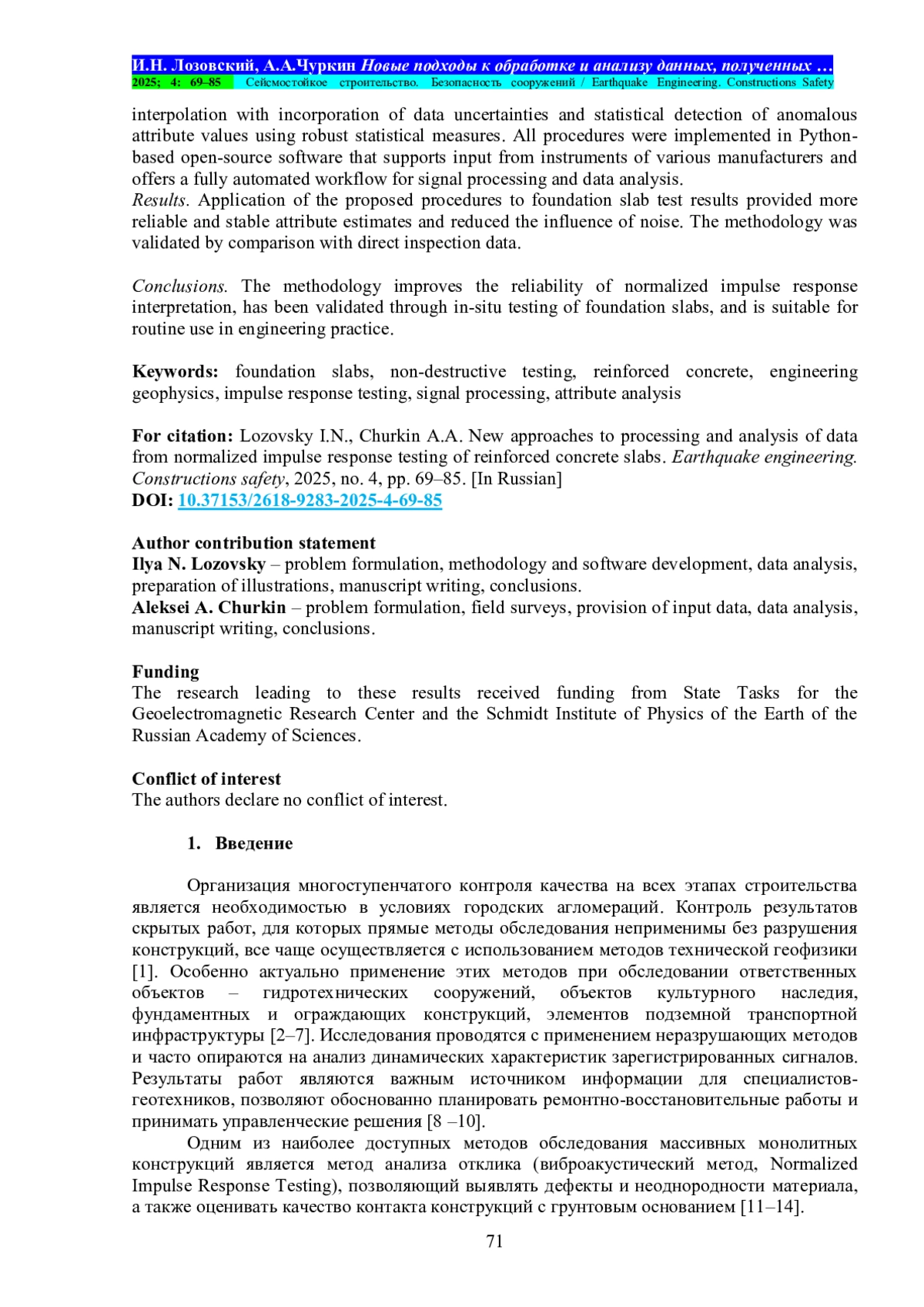 12. Чуркин А.А., Смирнов И.Д. Развитие методики анализа нормированного акустического отклика для оценки контакта конструкция-грунт // Сейсмостойкое строительство. Безопасность сооружений. 2023. № 3. С. 32-47. DOI: 10.37153/2618-9283-2023-3-32-47