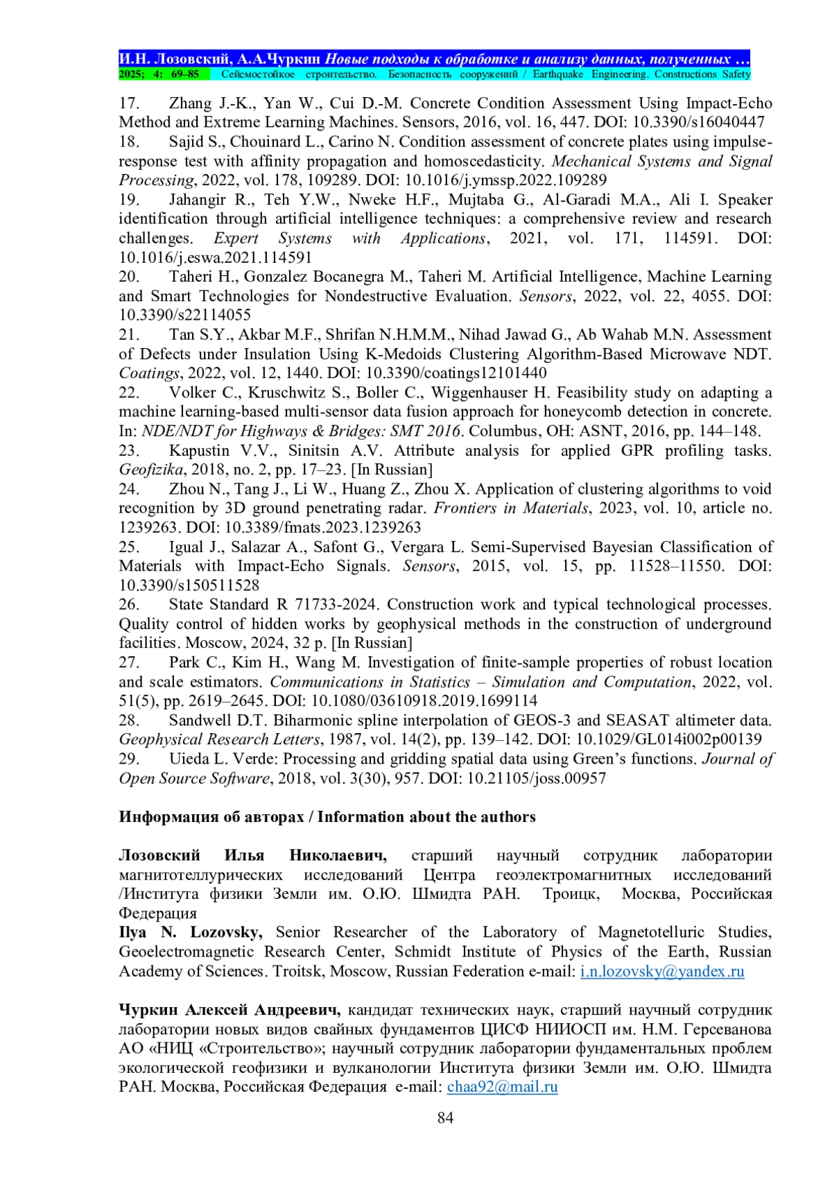 4. Судакова М.С., Калашников А.Ю., Владов М.Л. и др. Поиск конструктивных пустот в строительных конструкциях методом георадиолокации // Геотехника. 2017, № 2, С. 42-50.